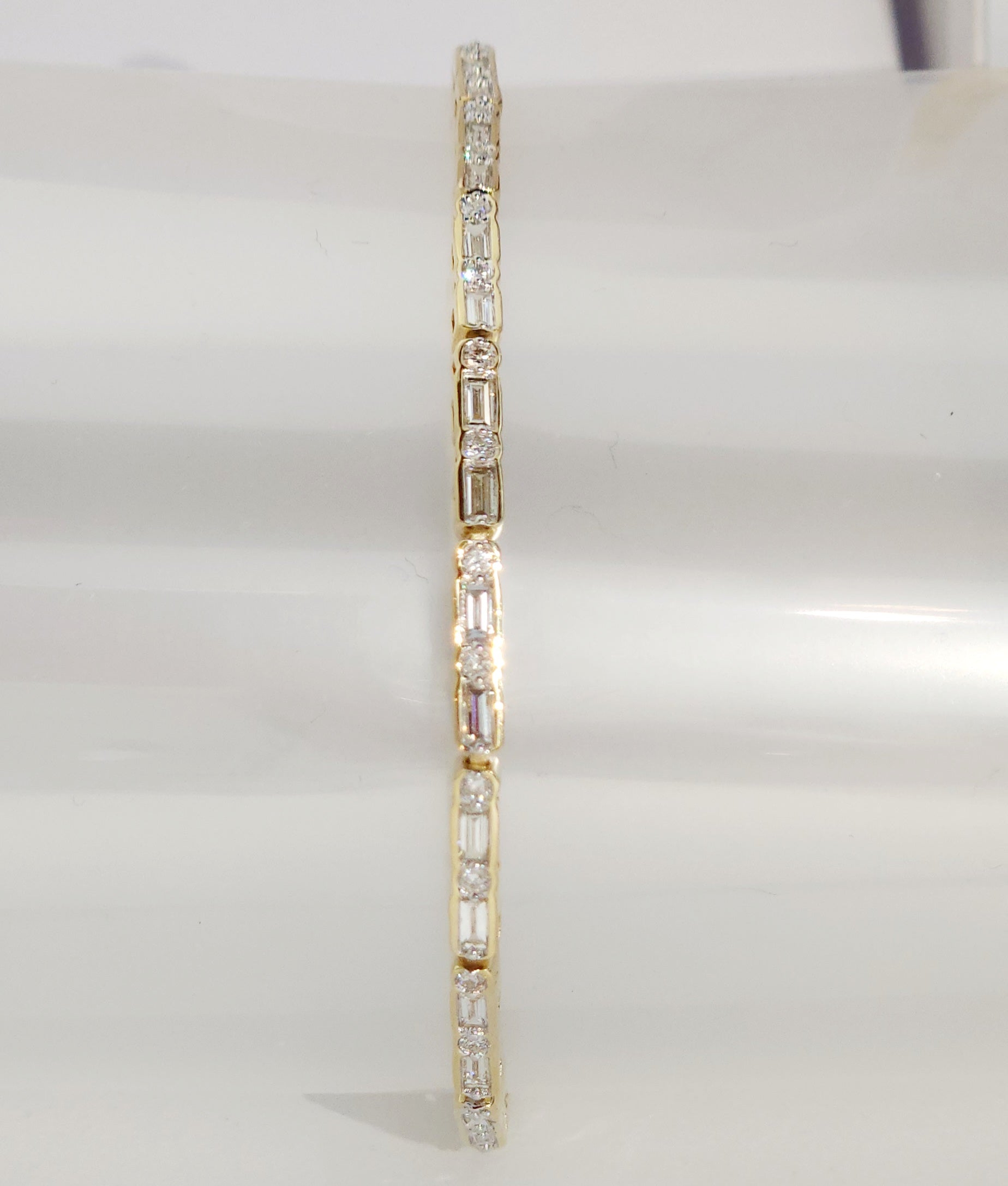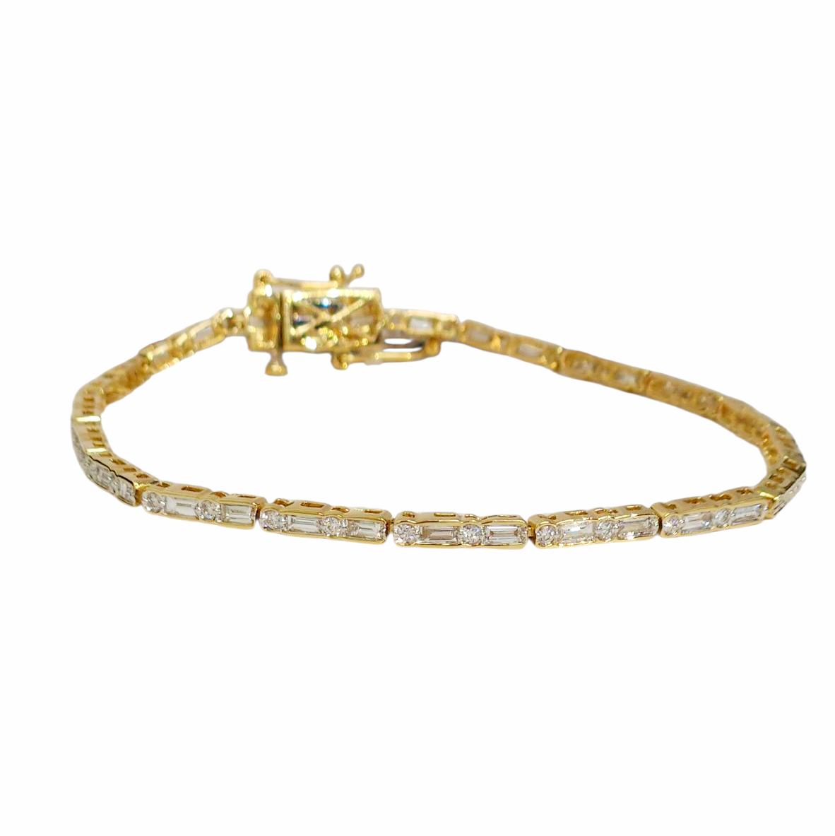 Geometry meets glam in one unforgettable bracelet - Make a statement without saying a word. This 14K gold diamond bracelet blends sharp sophistication with timeless sparkle, featuring a striking duo of diamond cuts: 1.483 CT baguette diamonds — Sleek and linear, for architectural elegance and 0.408 CT round diamonds — Classic brilliance that catches every flicker of light