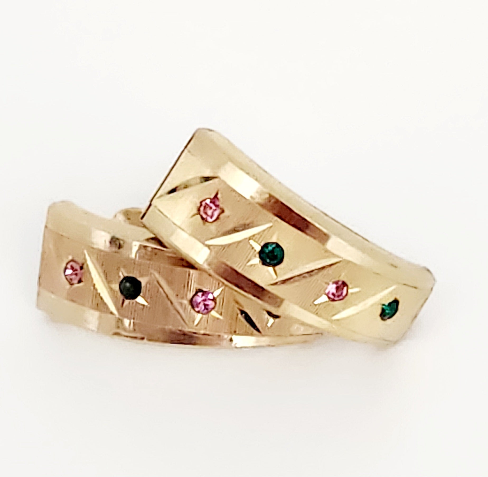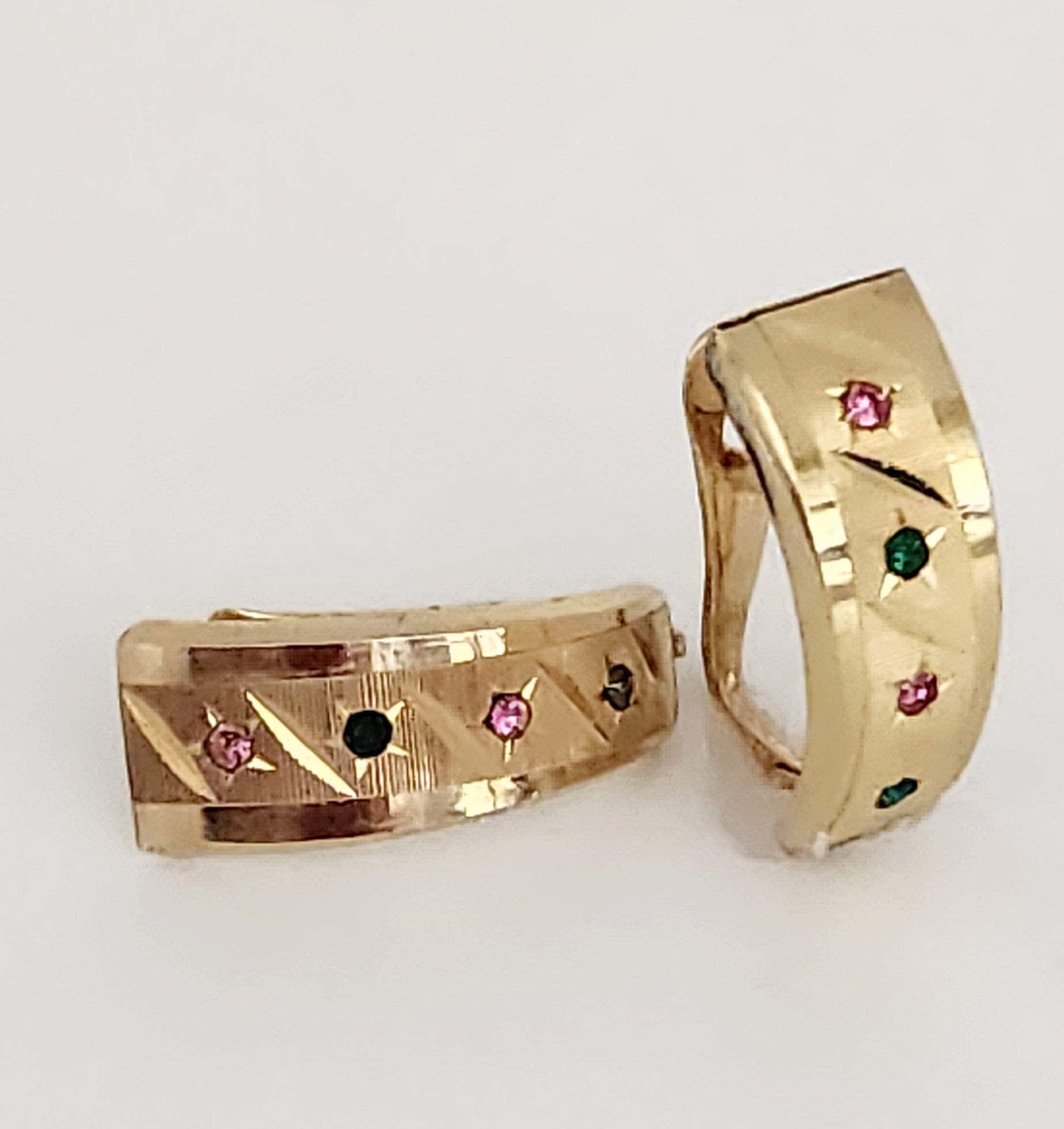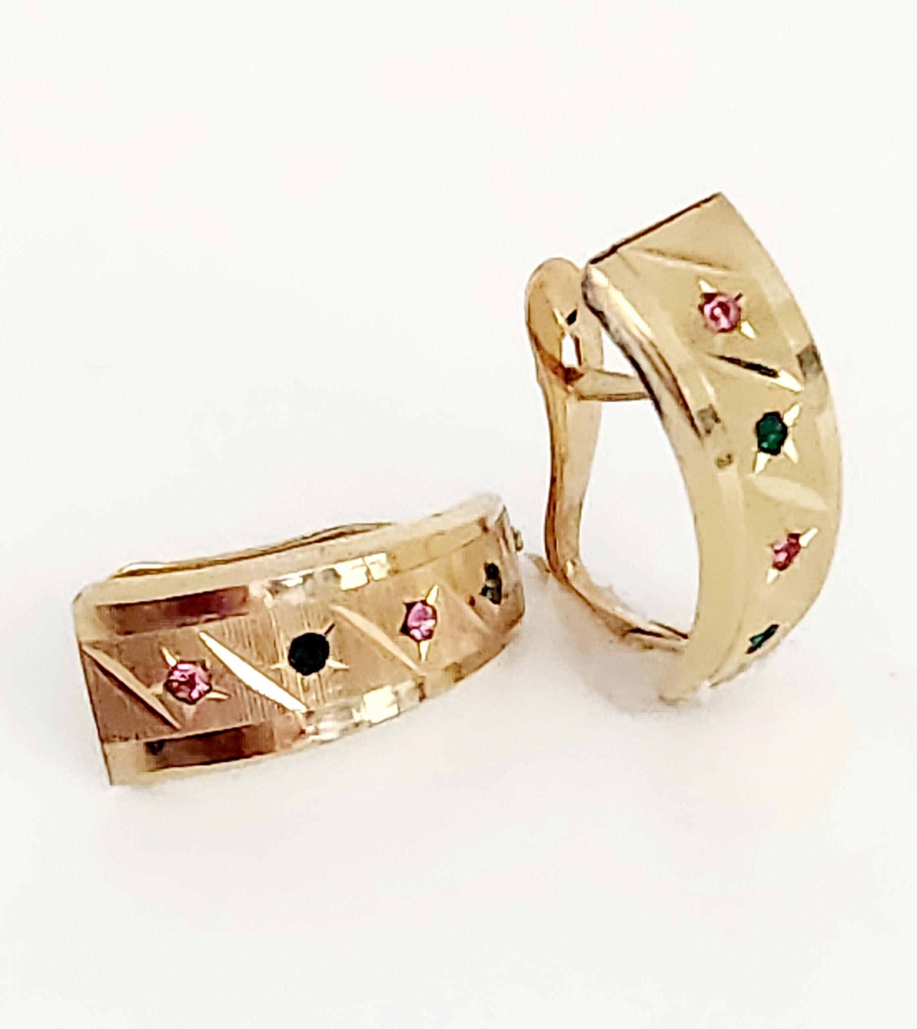 14K yellow gold pink and green rhinestones Leverback earrings.
