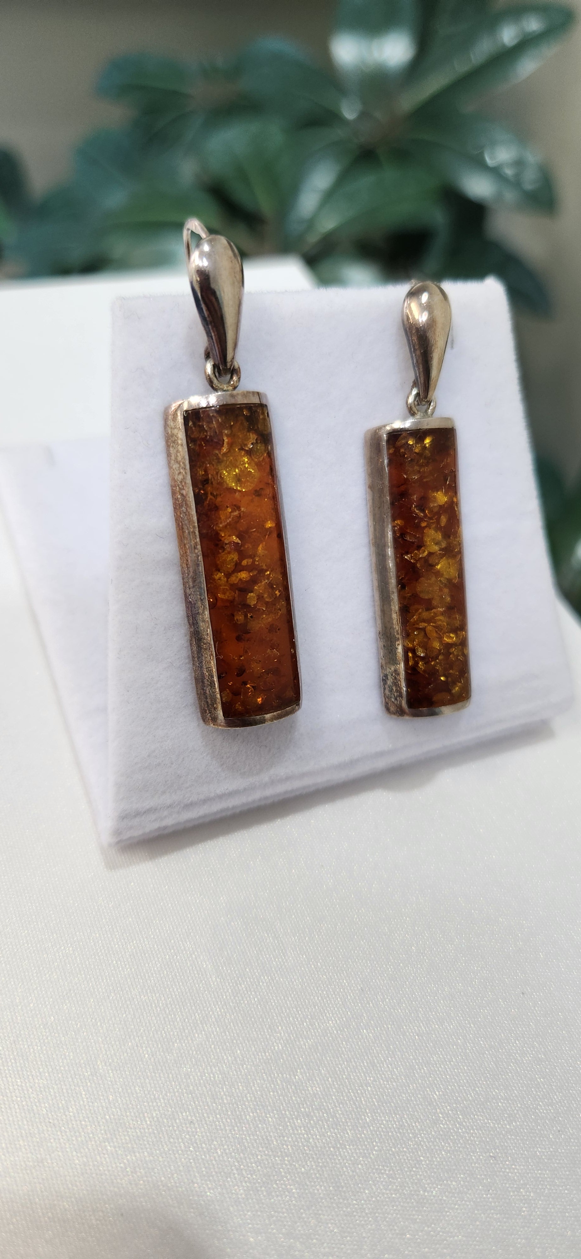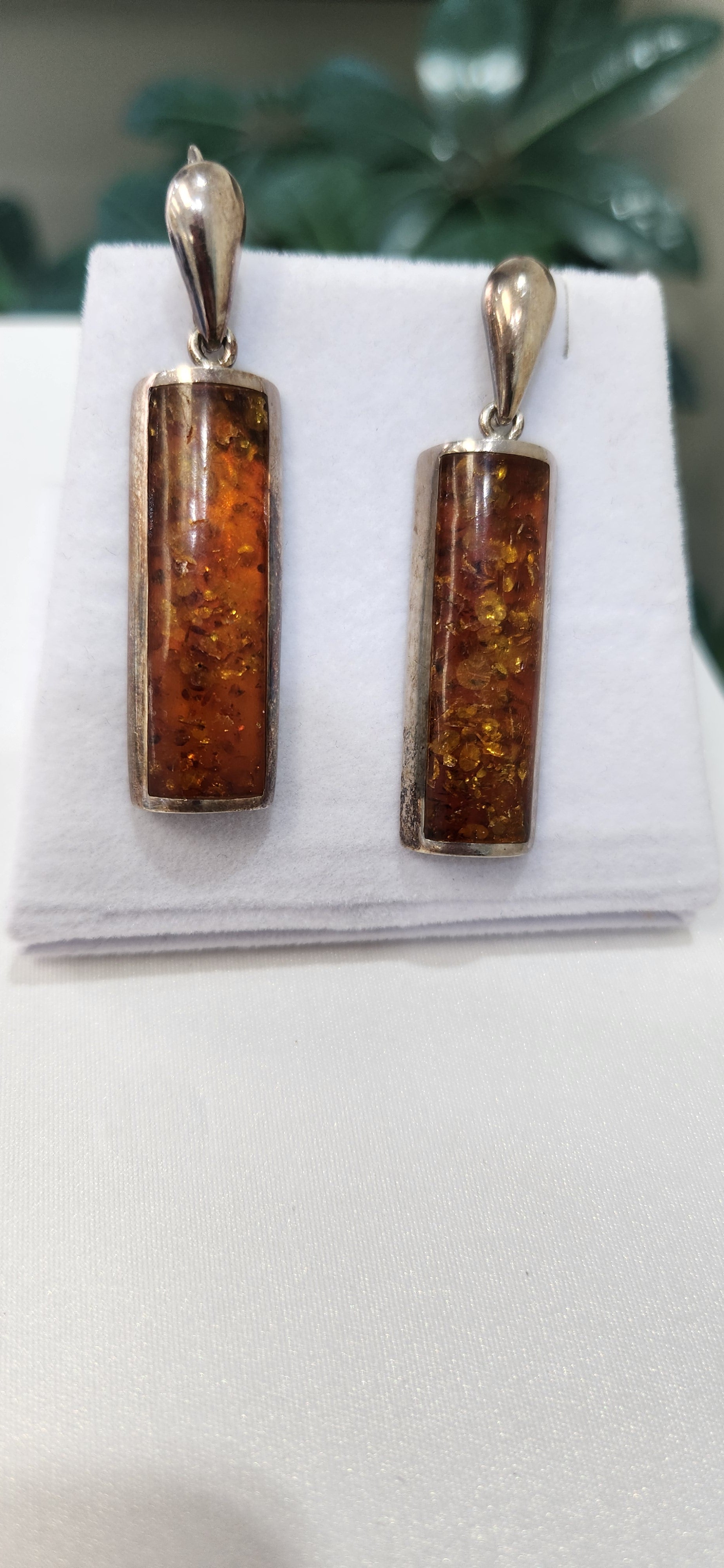 Luscious rectangular Amber dangling in Sterling Silver setting. The color is fantastic and really pops. 9.9g total. At this price, they are a total steal!