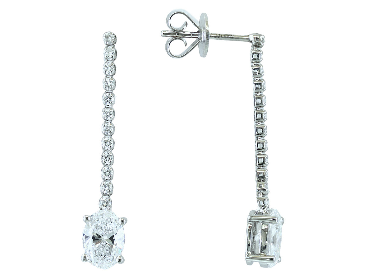 These elegant 14KW dangle earrings feature lab-grown diamonds with a combined total weight of 1.76 carats, including two stunning oval diamonds totaling 1.50 CT. Weighing 2.3 grams, they offer luxurious sparkle and graceful movement, perfect for adding refined sophistication to any look.