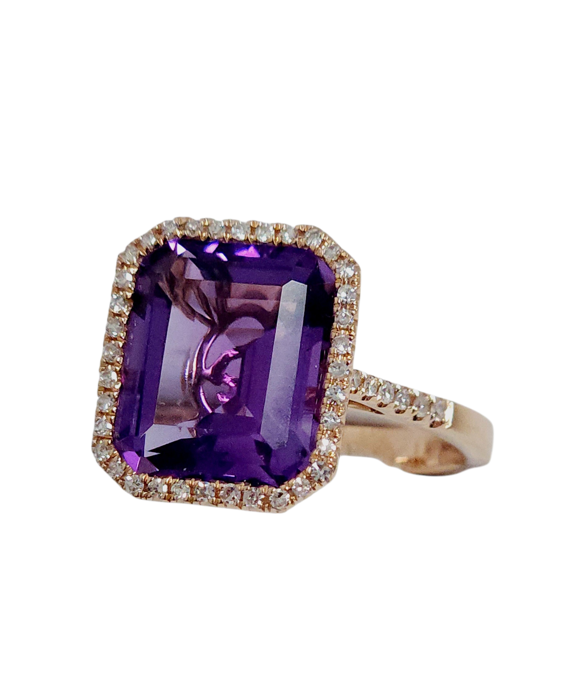 Elevate your everyday elegance with this stunning EFFY ring, featuring a radiant 5.15-carat amethyst centerpiece cradled in a shimmering diamond halo. Crafted in luxurious 14K rose gold, the warm metallic tone beautifully complements the rich purple gemstone while 0.19 carats of sparkling diamonds frame the stone with timeless sophistication. A refined piece that transitions seamlessly from day to evening, perfect for those who appreciate fine jewelry with distinctive character and enduring beauty.