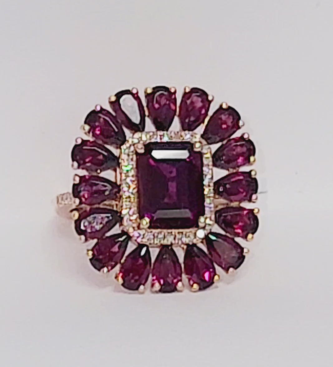 This elegant cocktail ring showcases a 14K rose gold emerald-cut Rhodolite center, surrounded by a delicate .16 CT diamond halo. Enhancing its vibrant allure, 16 pear-shaped Rhodolite stones frame the design, bringing the total carat weight to 7.10 CT. A refined statement piece that beautifully balances brilliance and rich color.