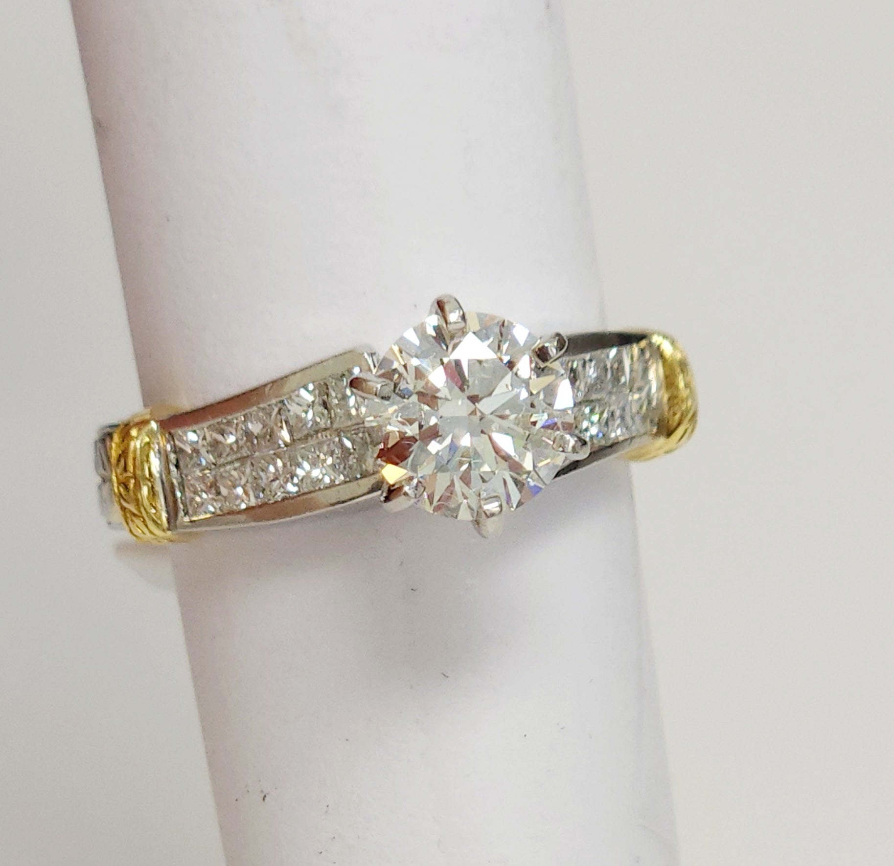 This exquisite engagement ring features a stunning 1.30 CT round center diamond secured by a classic 6-prong setting. Surrounding it are twenty princess-cut diamonds, invisibly set in platinum and 18K gold, totaling 0.70 CT. With VS clarity and color grades ranging from F to I, this ring combines timeless elegance with exceptional craftsmanship, perfect for symbolizing your everlasting commitment. size 6.5, 10.3g