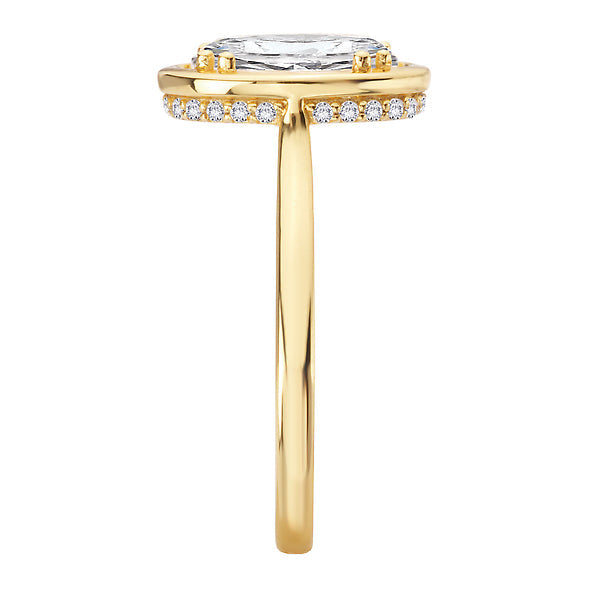 14kt yellow gold semi-mount engagement ring with a hidden halo of diamonds underneath a center setting that will accommodate a 10X7.5mm oval shaped stone. (D 1/8 carat total weight)