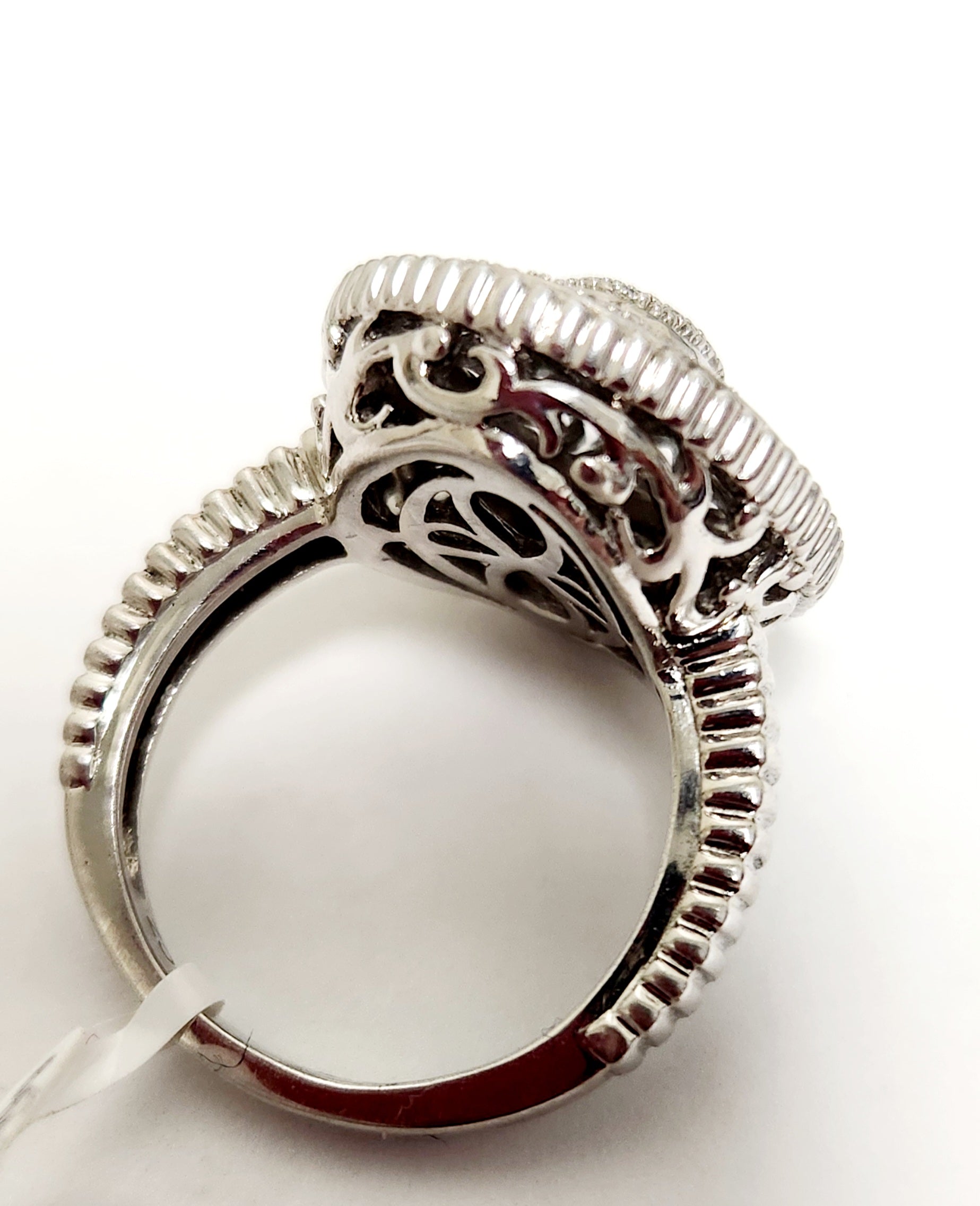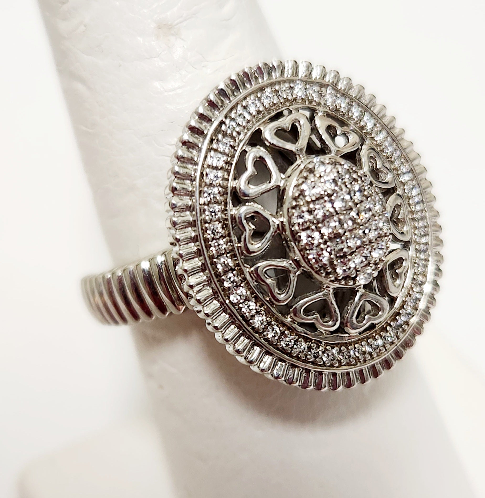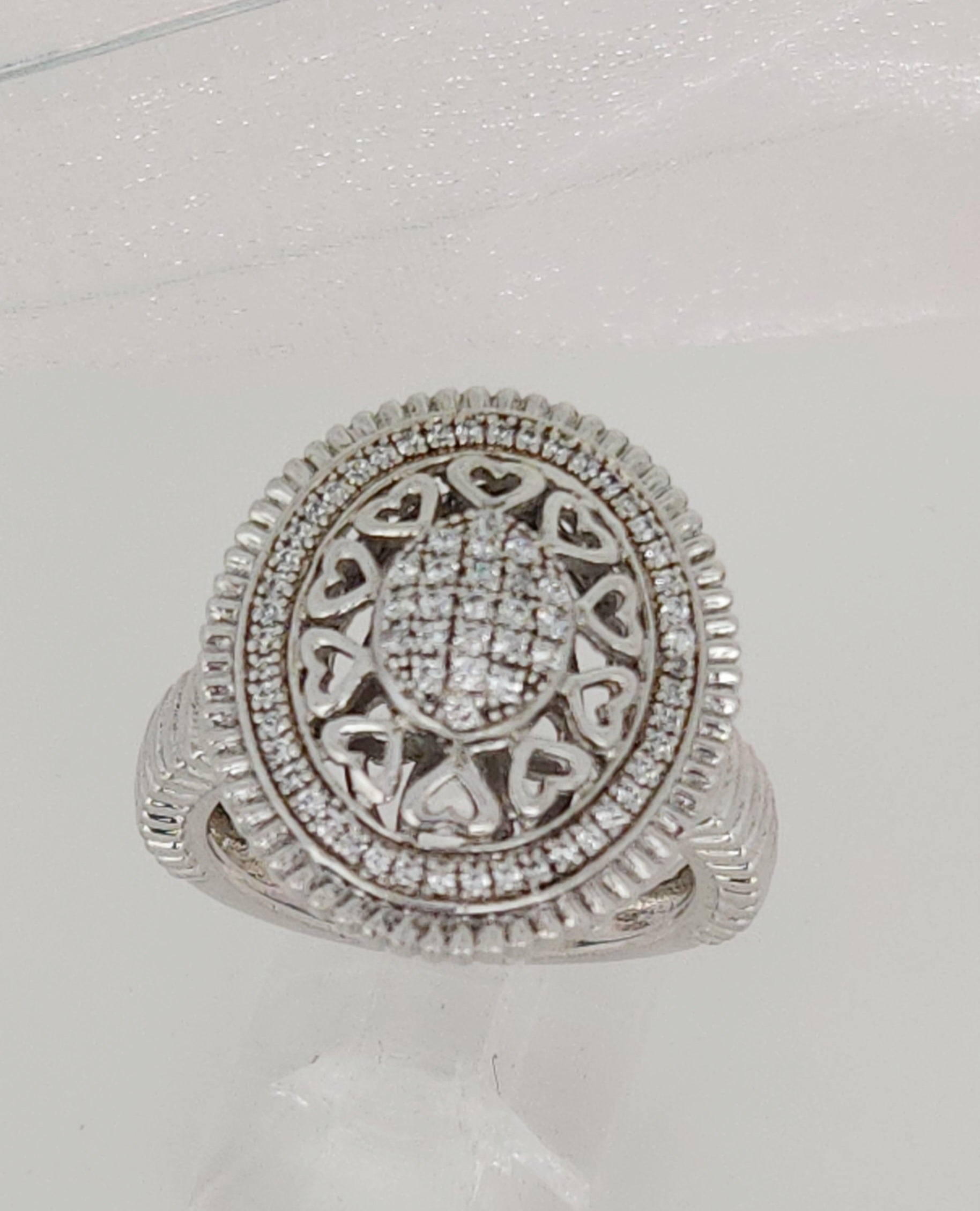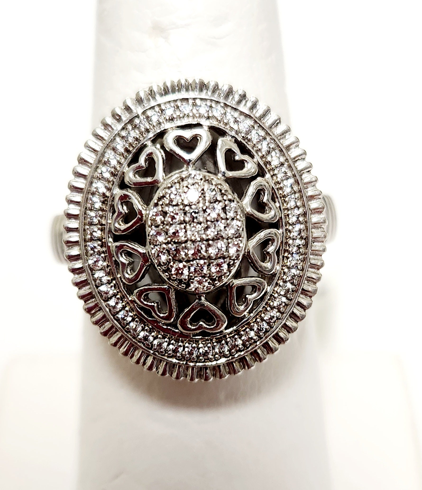 Beautifully crafted multi-dimension oval ring with Cubic Zirconia's in center surrounded by a heart halo which is surrounded by another Cubic Zirconia halo, set in an ornated basket, crafted in 925 Sterling Silver, 7.3g, sz 7