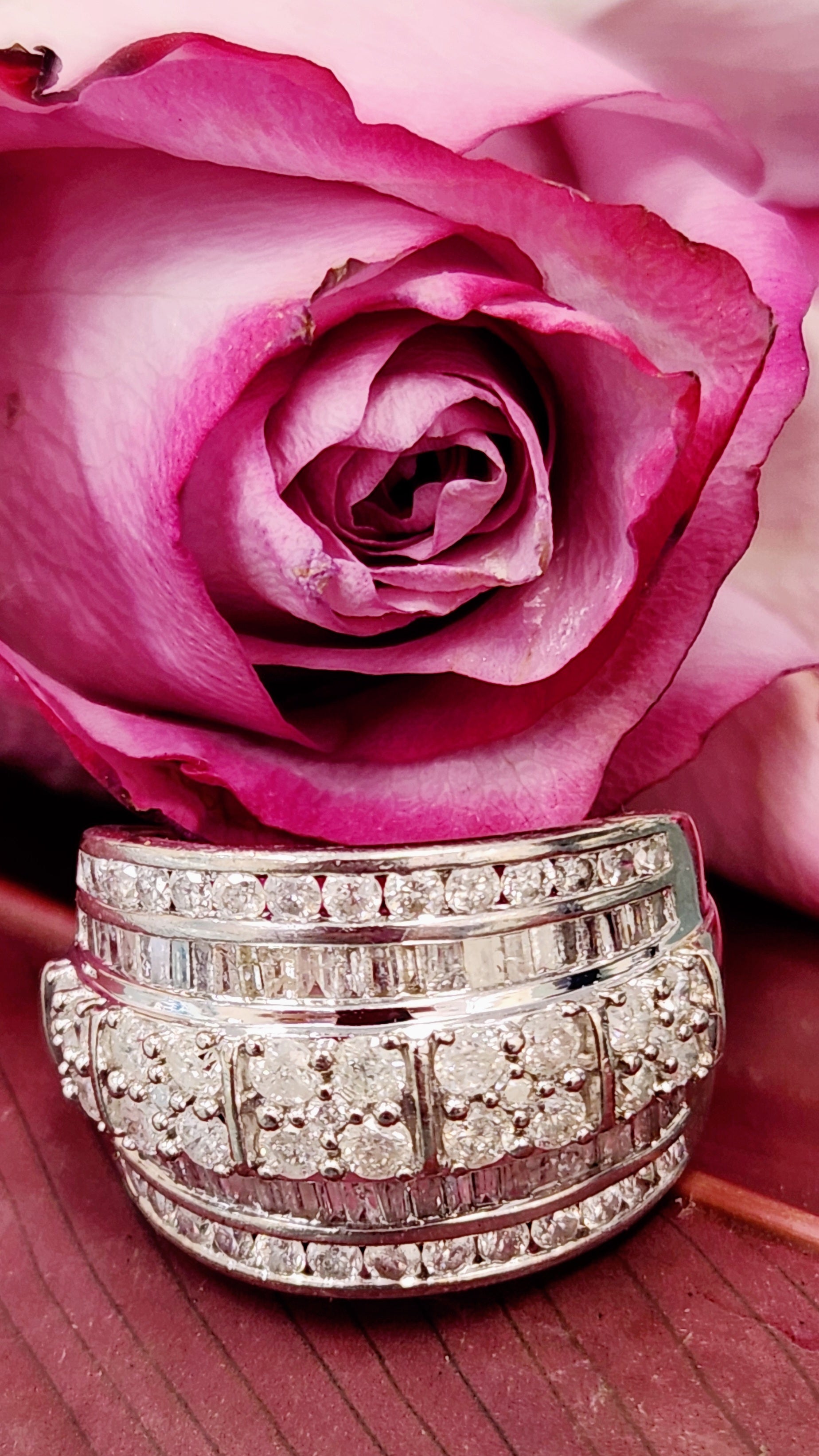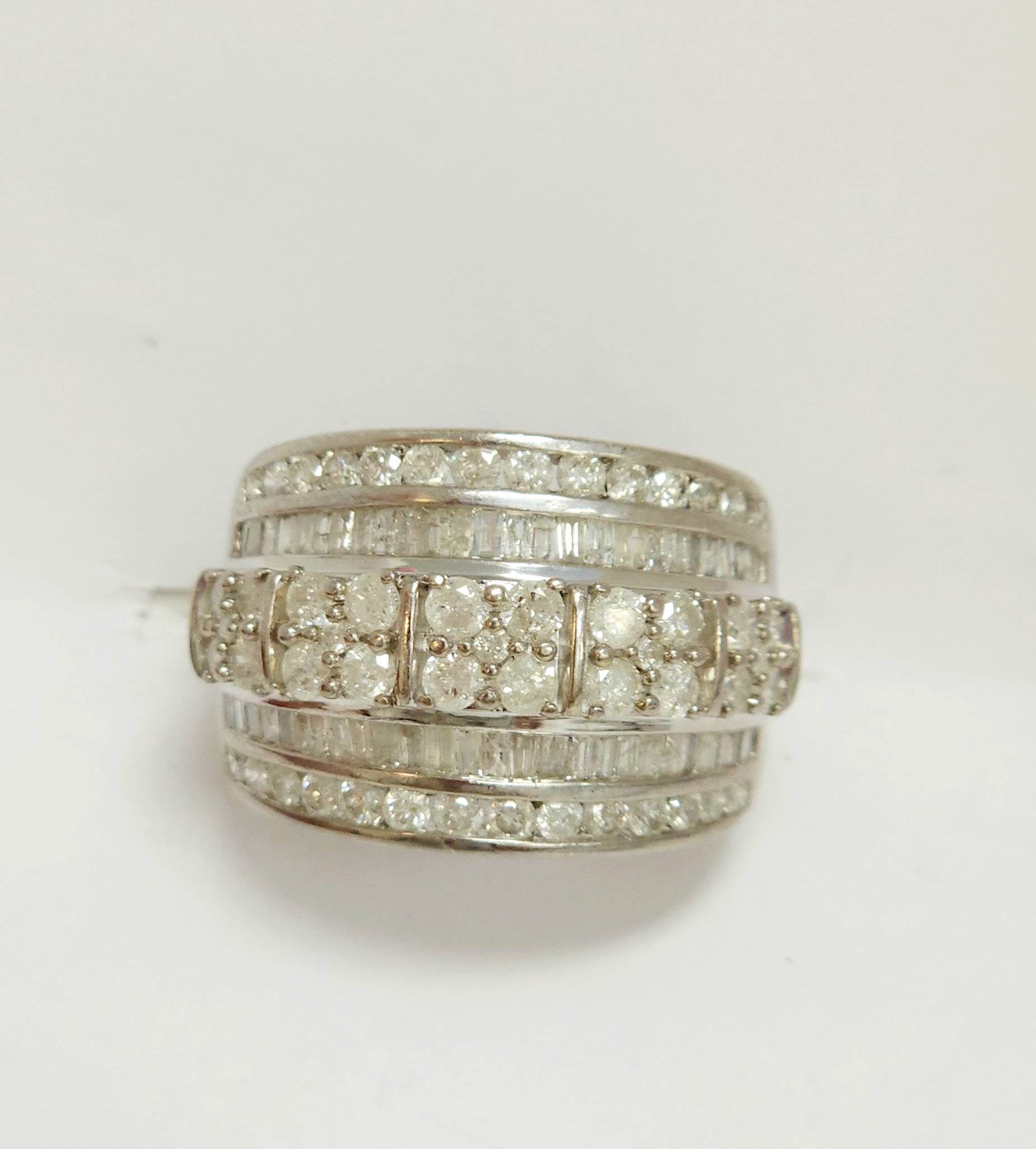 This Diamond ring will give you the big look you've been wanting! A total of 98 round and baguette Diamond set in 925 Sterling Silver, 6.4g, sz. 7