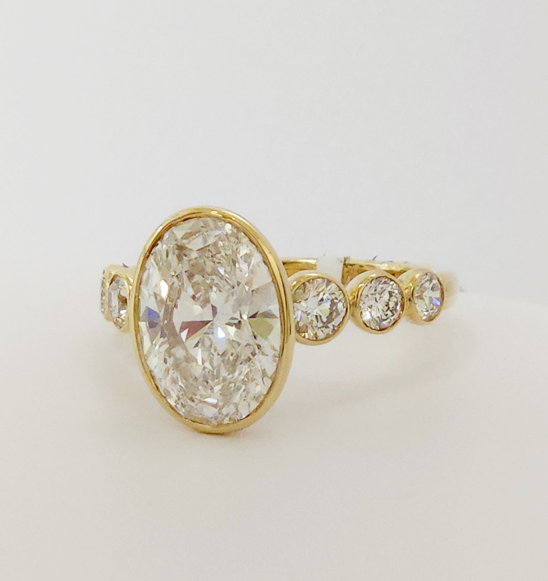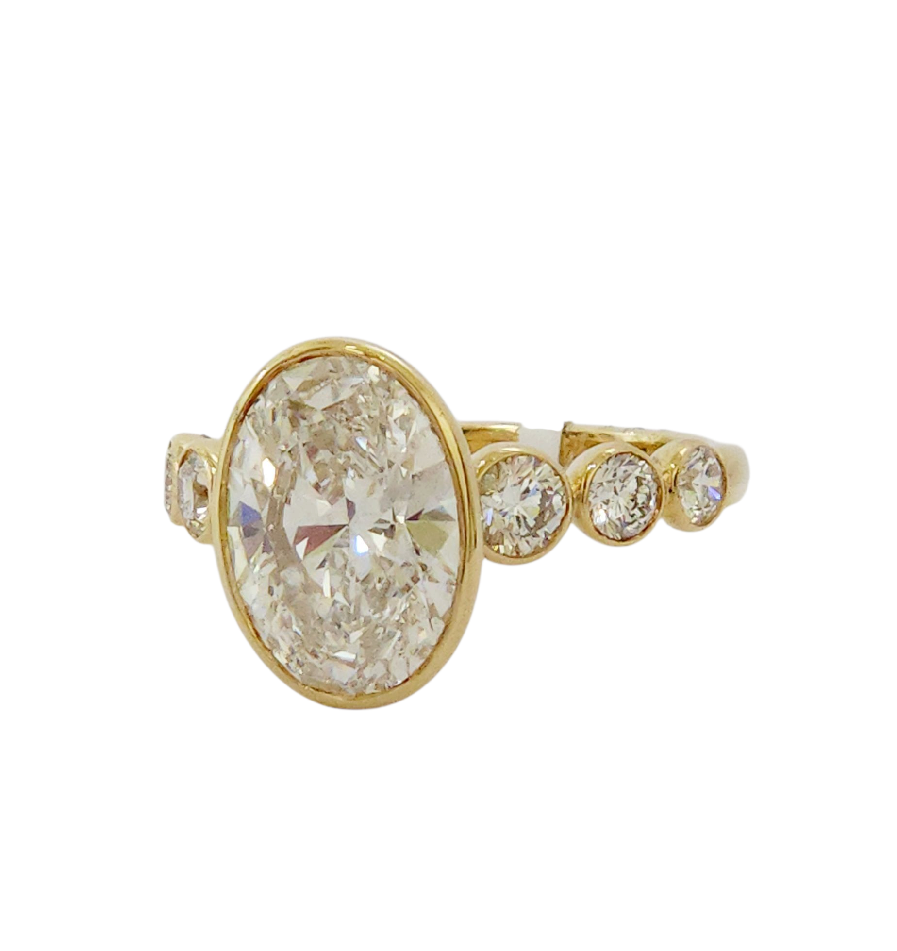 Extraordinaire 3.0 CT center oval lab grown diamond engagement ring with 6 graduating diamonds on sides for a combined total of 3.75 CT, G-H, SI1, crafted in 14K yellow gold