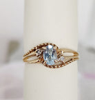 Charming and Dainty 6x4mm oval Blue Topaz & 2 round Melee Diamond ring crafted in 10K yellow gold on a roped split band, sz 7