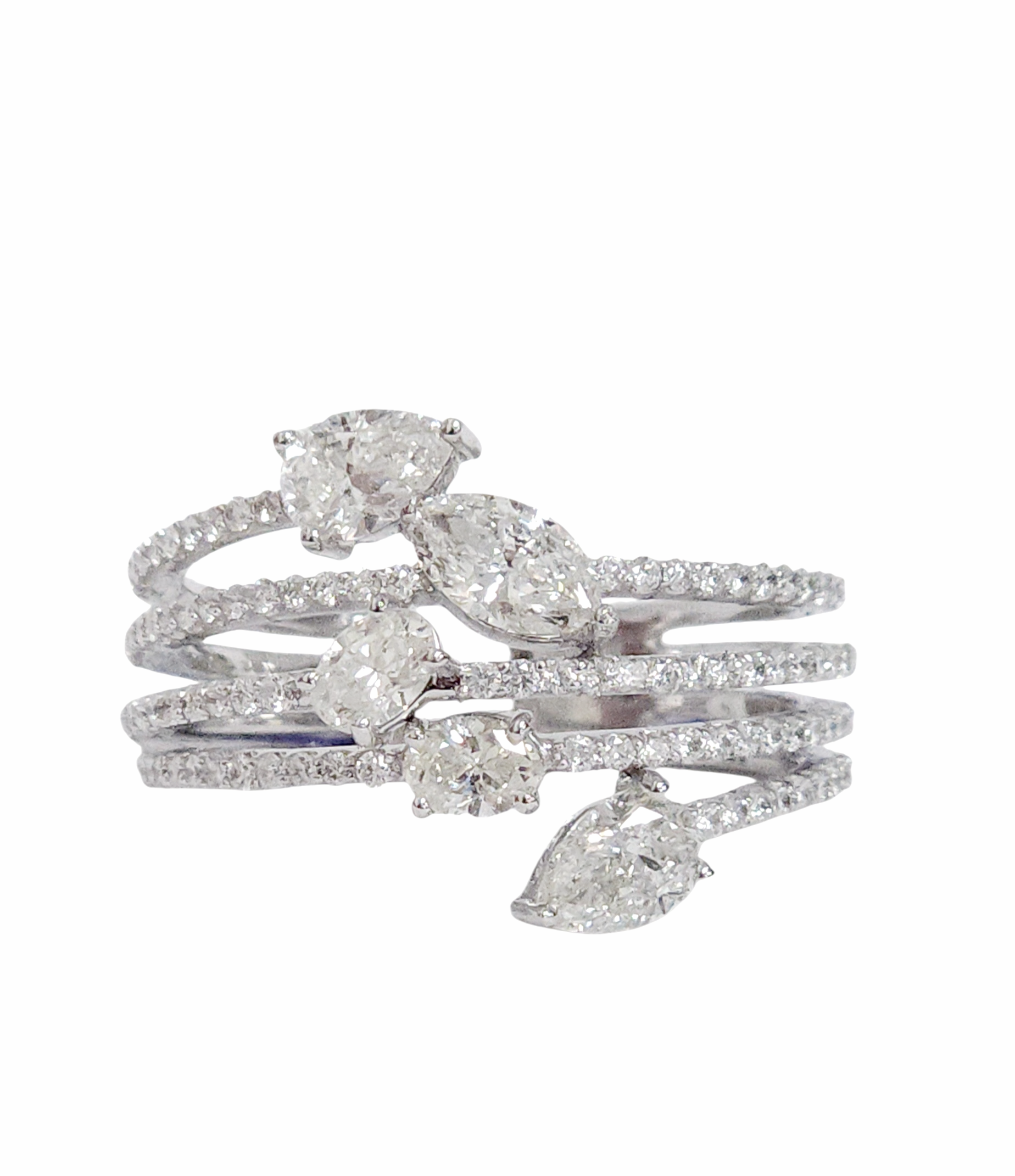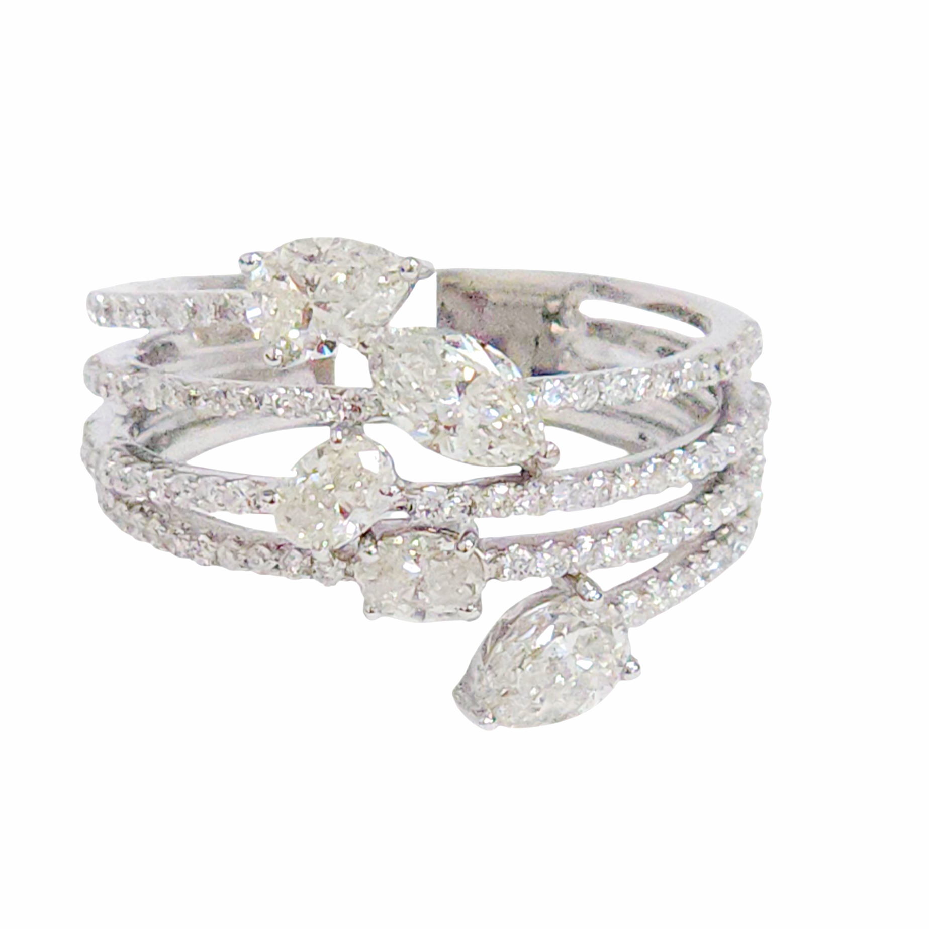 This exquisite fashion band showcases a sophisticated blend of diamond cuts arranged in four graceful rows. Featuring 0.50 carats of brilliant round diamonds complemented by 0.30 carats of oval stones, 0.66 carats of elegant pear shapes, and 0.26 carats of a striking marquise diamond, this piece totals 1.71 carats of radiant sparkle. Crafted to size 8 with a refined weight of 5.15 grams, this band combines timeless elegance with contemporary design, making it a versatile addition to any jewelry collection.