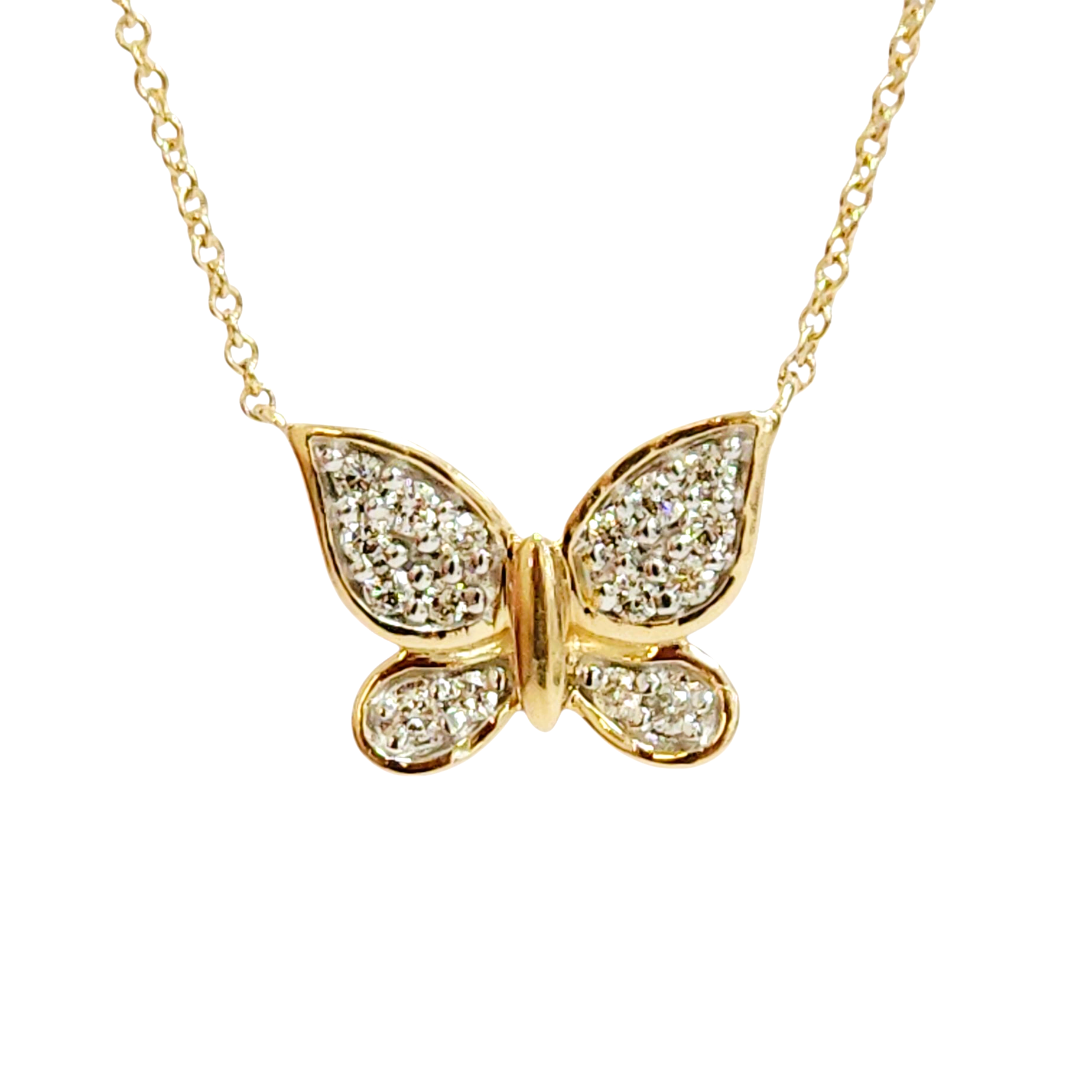 This exquisite butterfly necklace is crafted from 10K yellow gold and features a delicate 1/6 carat sparkling diamond that adds a touch of refined elegance. Its graceful design captures the beauty of nature, making it a perfect accessory for any occasion. Matching earrings are also available to complete your sophisticated look.