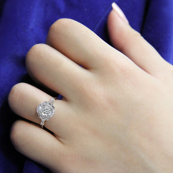 Bridal ring features an oval halo lined with milgrain detail and round faceted diamonds are set in high polished 14kt white gold. (D 1/5 carat total weight) This ring is a SEMI-MOUNT and it comes with NO CENTER STONE as shown but it will accommodate a 7.5x5.5mm oval center stone.