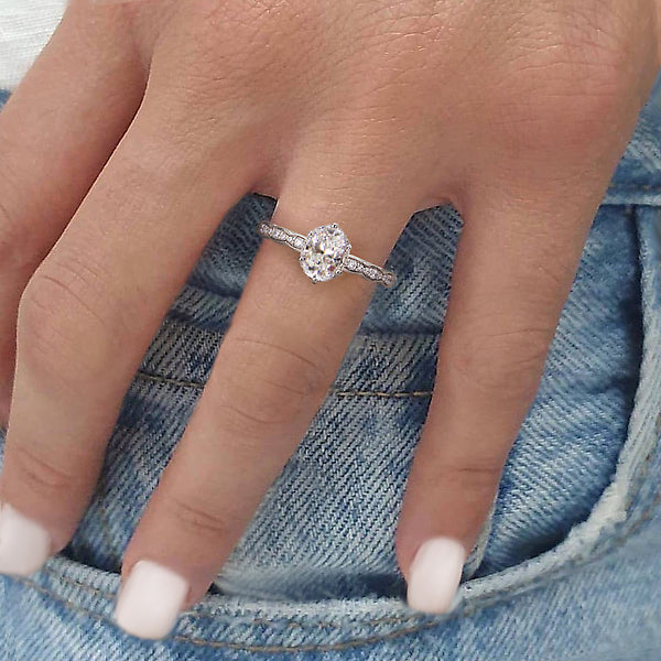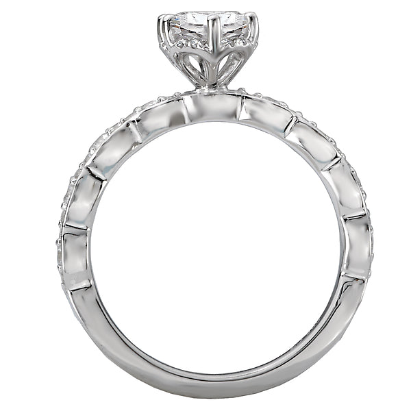 This semi-mount 14kt white gold engagement ring has a scalloped shank lined with diamonds and an inset halo of diamonds that showcases a setting that will accommodate a 7.5x5.5mm oval diamond. (D 1/5 carat total weight)