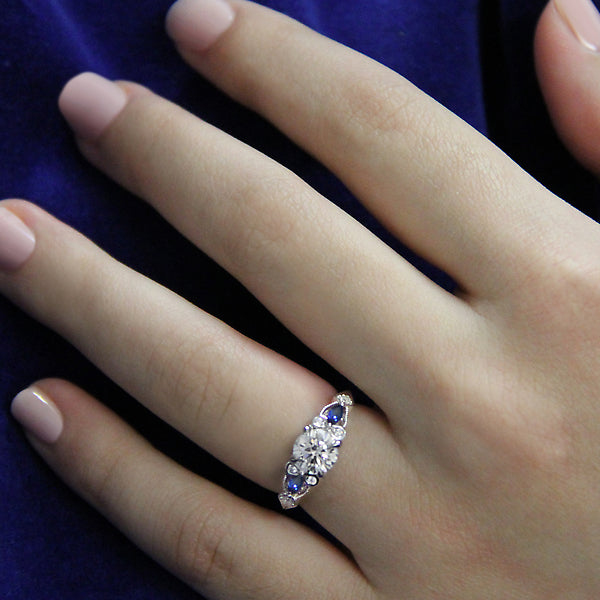 This expertly hand-crafted 14kt white gold ring accented with milgrain detail, displays brilliant cut sapphires and round diamonds surrounding the center claw prong setting that will accommodate a round 6.5mm diamond (D .09 carat weight; S 1/5 carat weight)