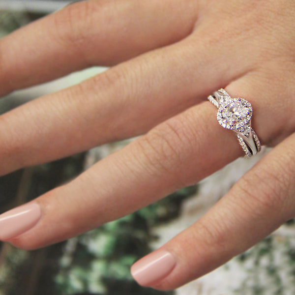 This diamond ring features intertwined shanks lined with brilliant cut diamonds, set in high polished 14kt white gold. A beautiful halo and two additional round diamonds surround the center setting that will accommodate an oval 7.5x5.5mm center. (D 1/2 carat total weight)