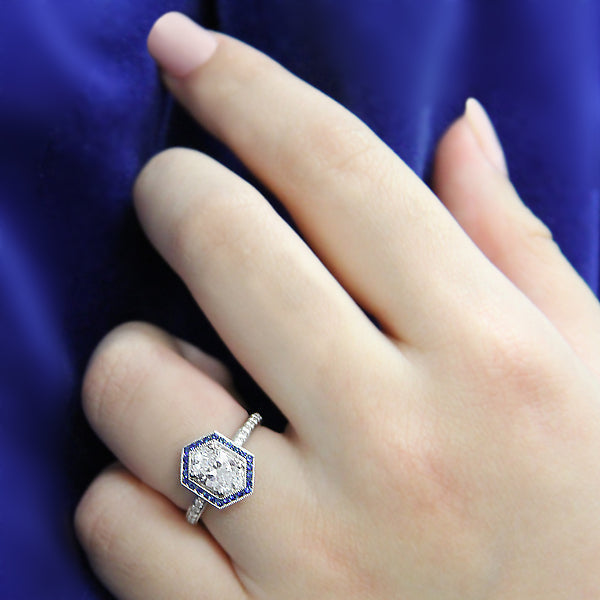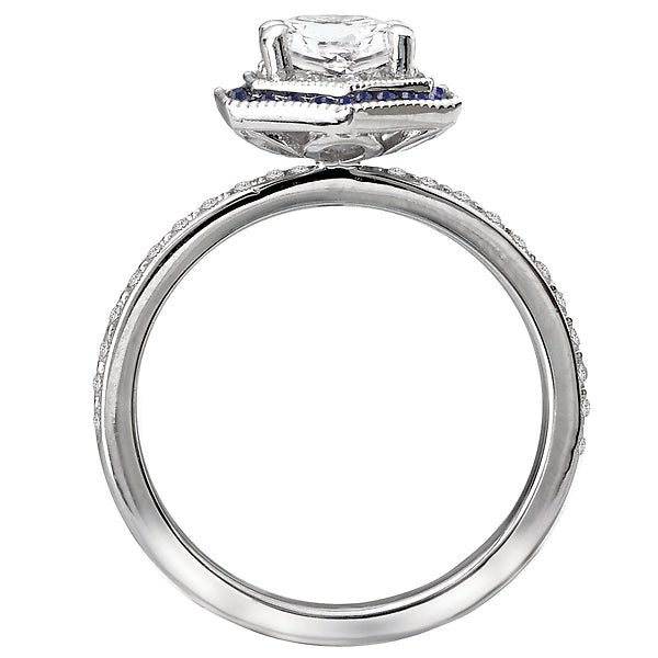 This sparkling beauty features a hexagon halo lined with sapphires surrounding the center setting that will accommodate an oval 7.5x5.5mm diamond set in high polished 14kt white gold. (D 1/4 carat weight, S 1/6 carat weight)