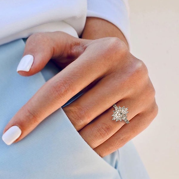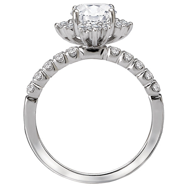 This elegant engagement ring features a oval halo created with sparkling diamonds and more diamonds lining the shank. All set in 14kt high polished white gold. (D 3/8 carat total weight) This SEMI-MOUNT ring comes with NO CENTER STONE but it will accommodate a 7.5x5.5mm oval center.