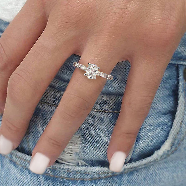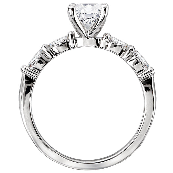 Beautifully hand crafted high polished 14kt white gold engagement ring features brilliant cut diamonds with a center setting that will accommodate an oval 7.5x5.5mm diamond of your choosing. (D 1/4 carat total weight)