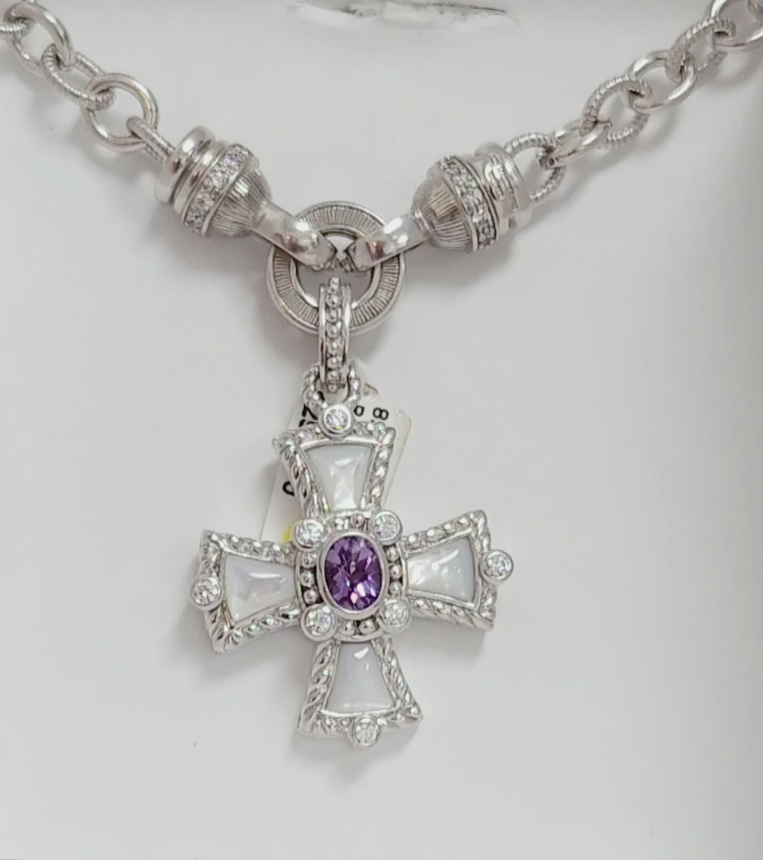 This exquisite Judith Ripka cross features a stunning combination of amethyst and mother of pearl, elegantly set in sterling silver. The cross weighs 20.4 grams. Please also see the matching versatile 17" Rolo chain and an enhancer holder, weighing 76.7 grams.