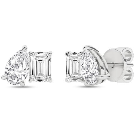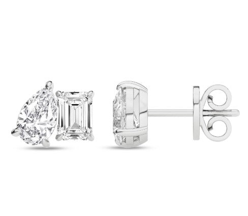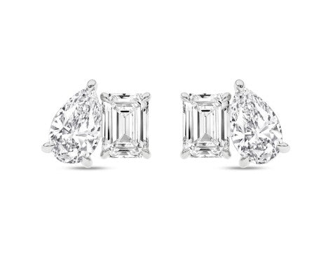 Toi et Moi, meaning Me and You. These two-stone earrings, made in 14KT white gold, boast a total carat weight of 2 CT of diamonds, featuring a captivating combination of a pear-shaped and an emerald-cut diamonds.