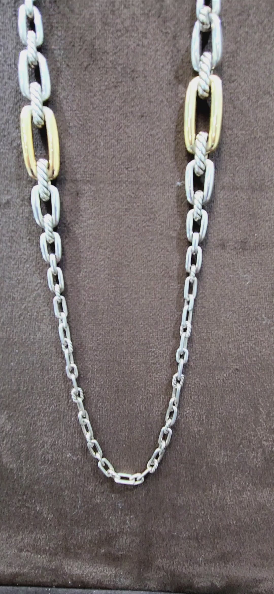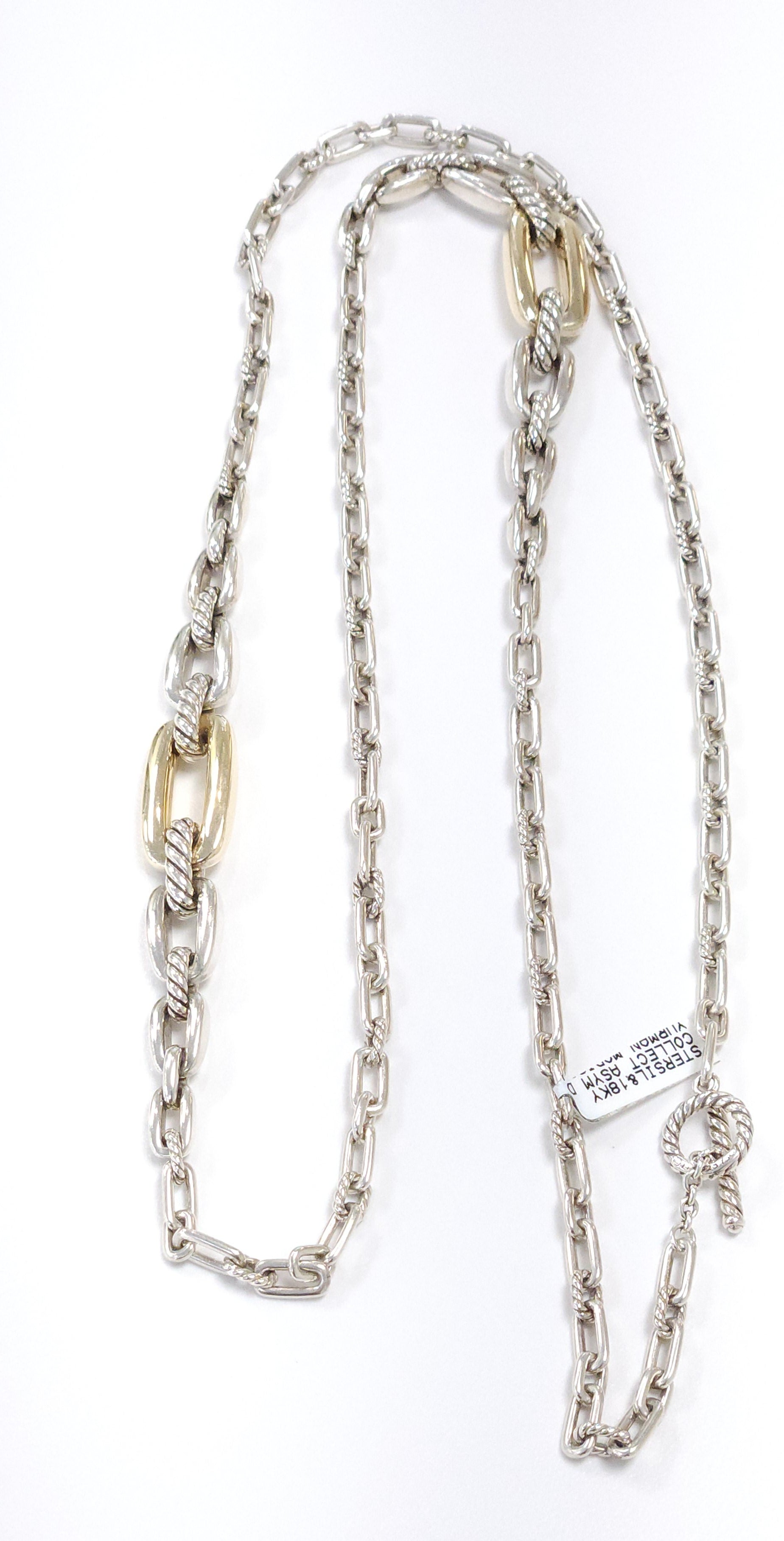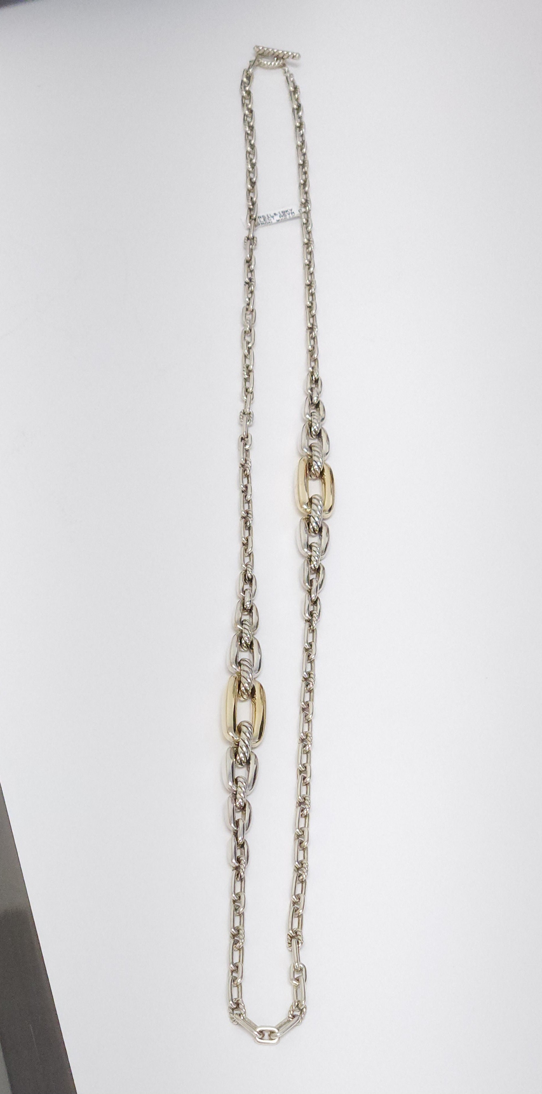 This exquisite David Yurman Madison Necklace exemplifies timeless luxury and sophisticated craftsmanship. Crafted from sterling silver and 18K yellow gold, this 34-inch collector's piece weighs a substantial 86.2 grams, reflecting its quality construction and presence. The harmonious blend of precious metals creates a refined aesthetic that transitions seamlessly from day to evening wear. A distinguished addition to any fine jewelry collection, this necklace showcases David Yurman's signature design excellence and enduring appeal for the discerning collector.