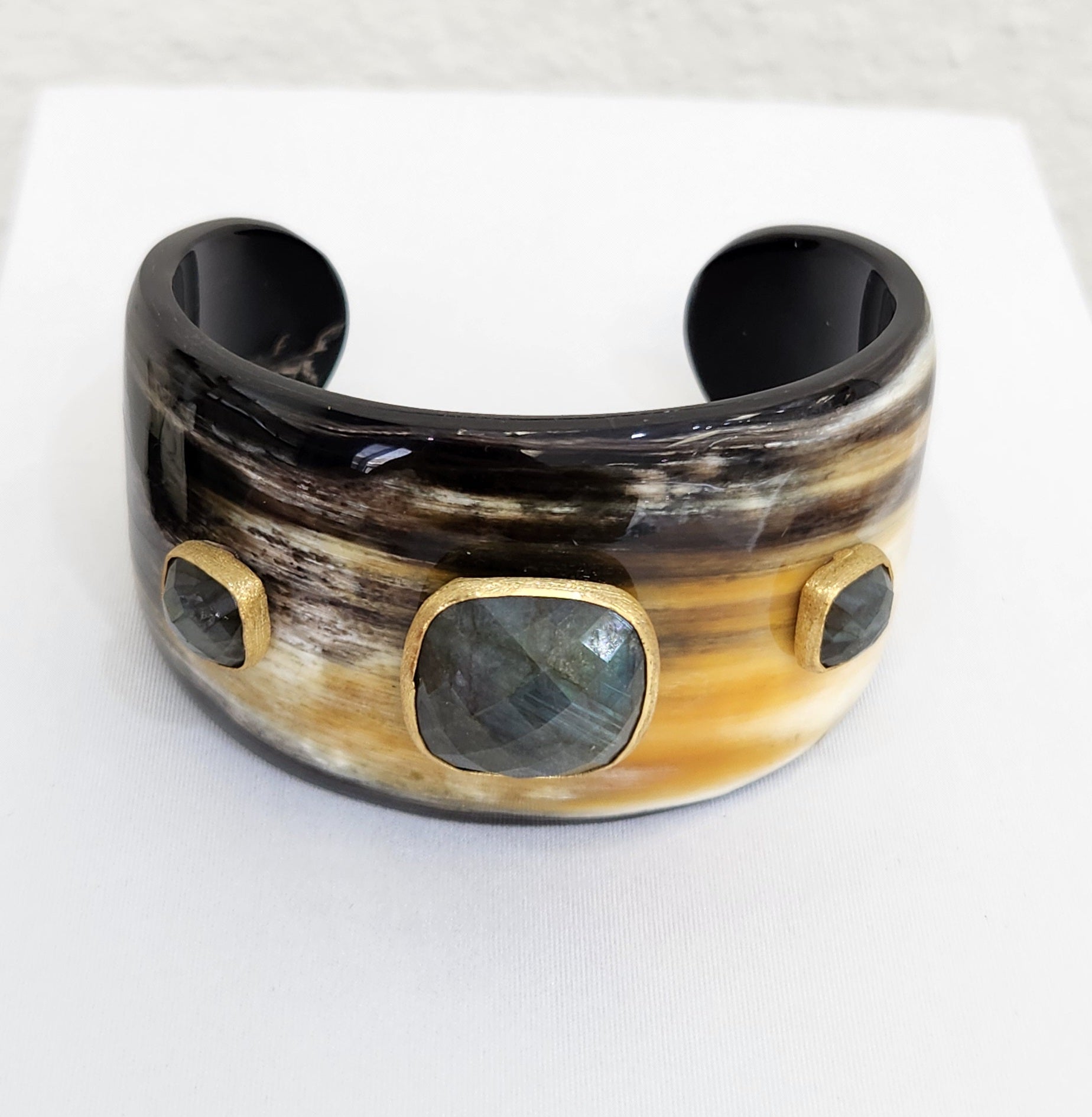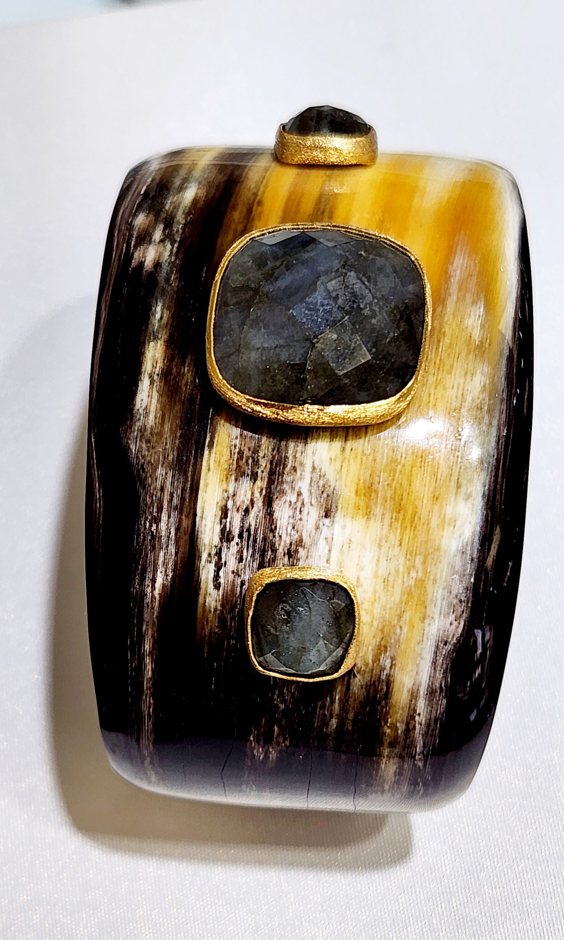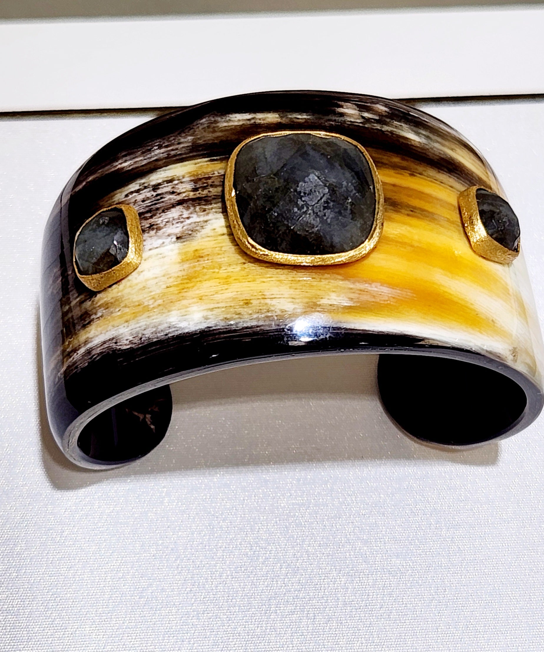 Beautiful natural Horn Bangle with Labradorite Center stones. Can not be sized. Fits approximately a standard 7 to 8 inch wrist