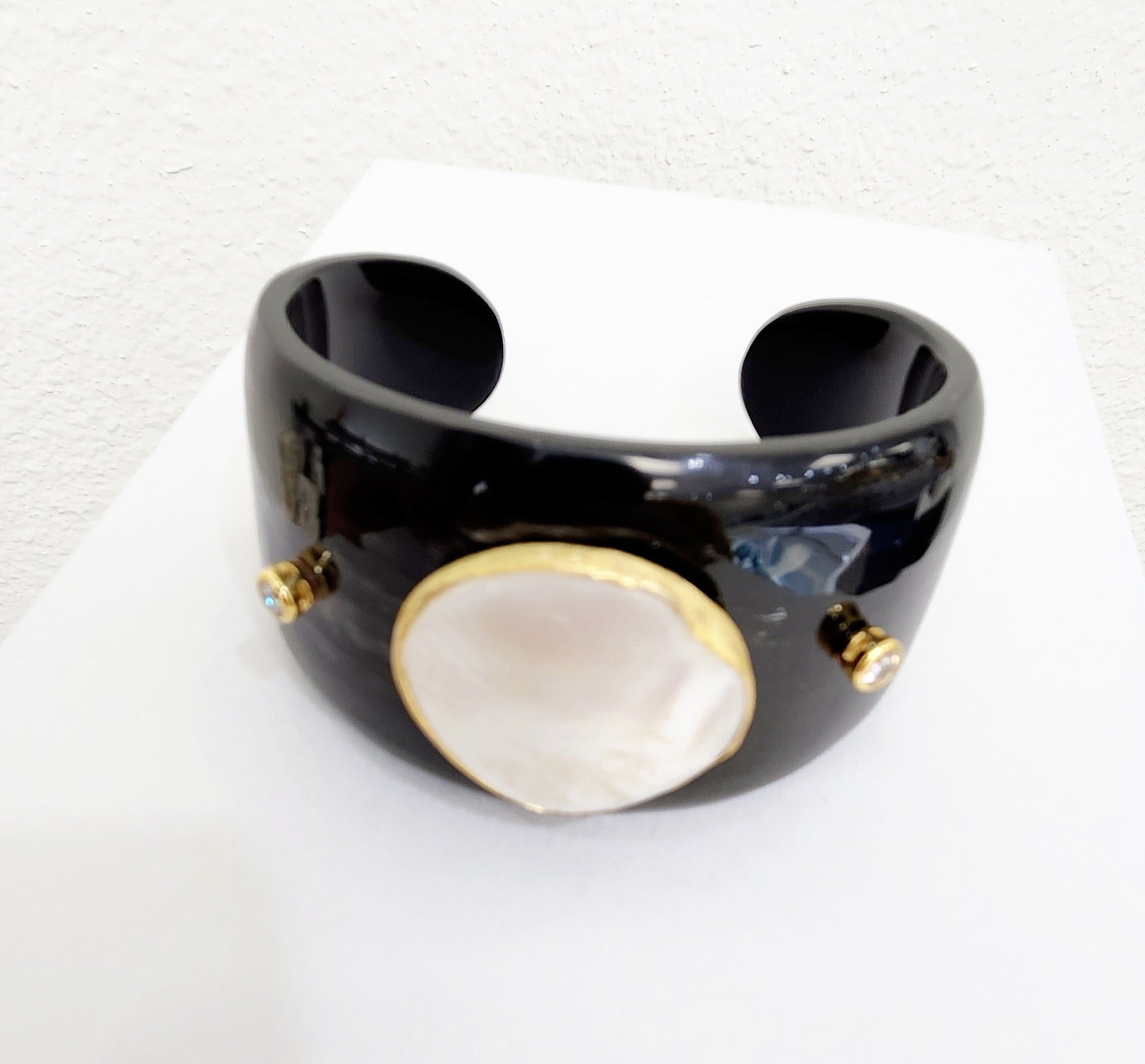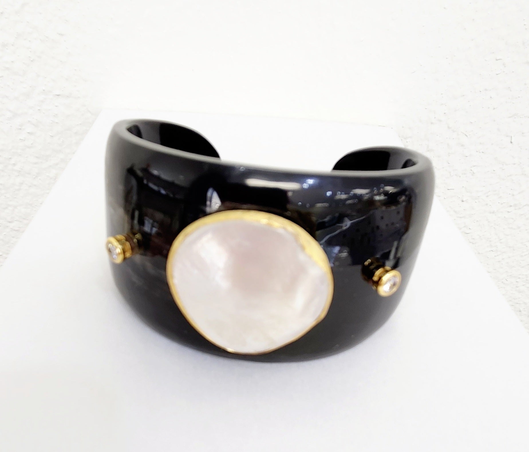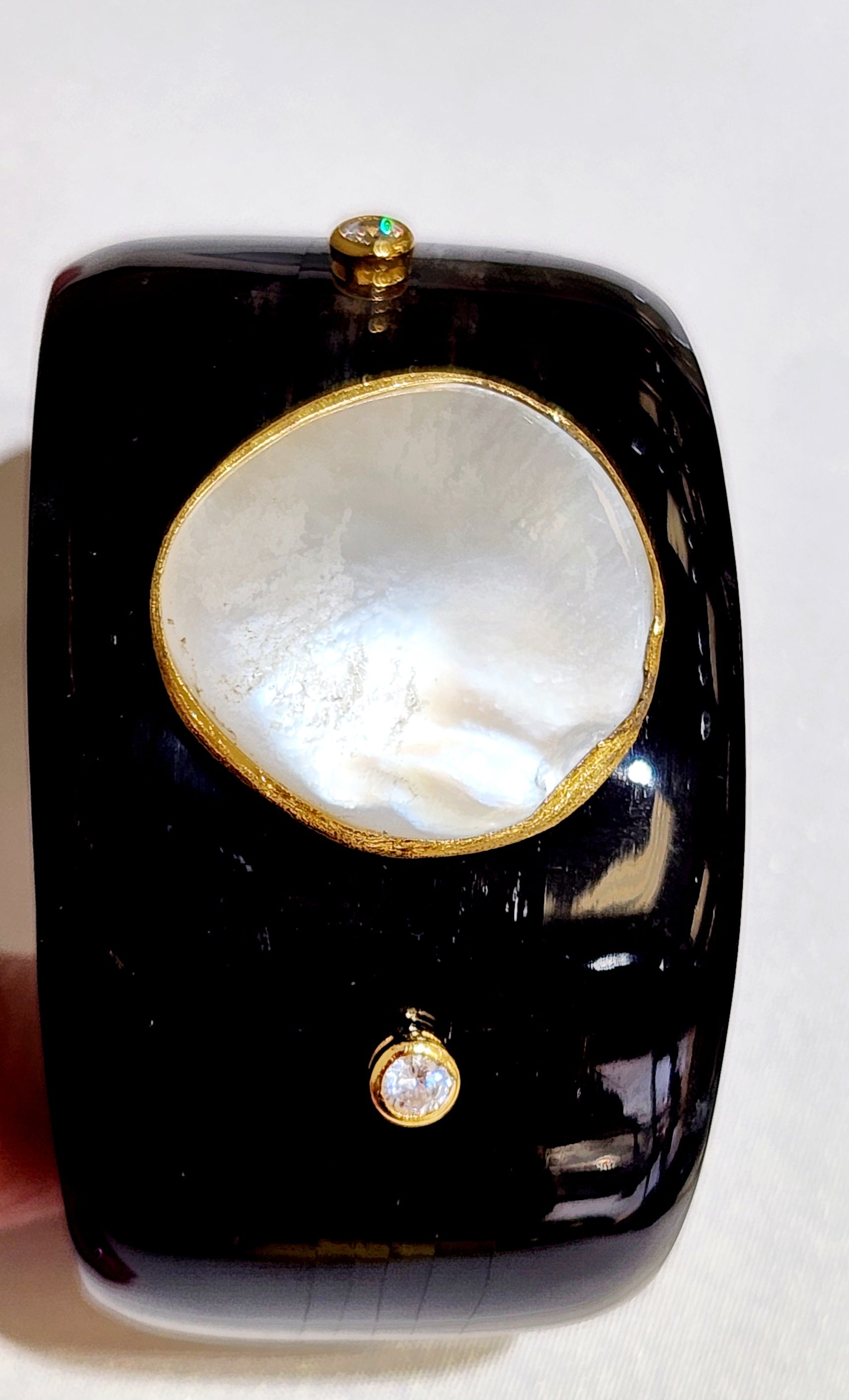 Beautiful natural Horn Bangle with Mother of Pearls and Cubic Zirconia. Can not be sized. Fits approximately a standard 7 to 8 inch wrist