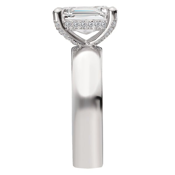 14kt white gold bold band and a hidden halo of round diamonds under a center setting that will accommodate a 9.5x7mm emerald cut diamond. (D 1/6 carat total weight)