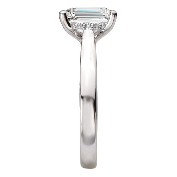 14kt white gold semi-mount engagement ring with a hidden halo of round diamonds under a center setting that will accommodate a 8.5 x 6mm emerald cut diamond. (D .08 carat total weight)