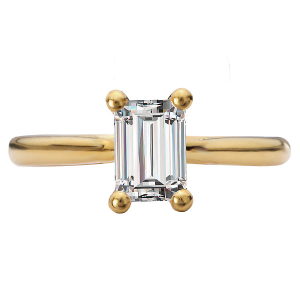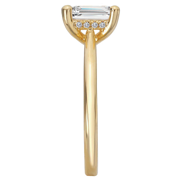 14kt yellow gold semi-mount engagement ring with a hidden halo of round diamonds under a center setting that will accommodate a 7x5mm emerald cut diamond. (D .09 carat total weight)
