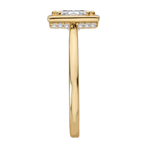 14kt yellow gold semi-mount engagement ring with a hidden halo of diamonds underneath a center setting that will accommodate a princess cut stone. (D 1/8 carat total weight)