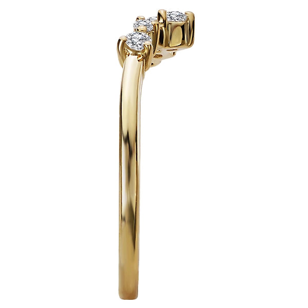 This is a 14kt yellow gold wedding band adorned with decoratively placed round diamonds. (D 1/6 carat total weight)