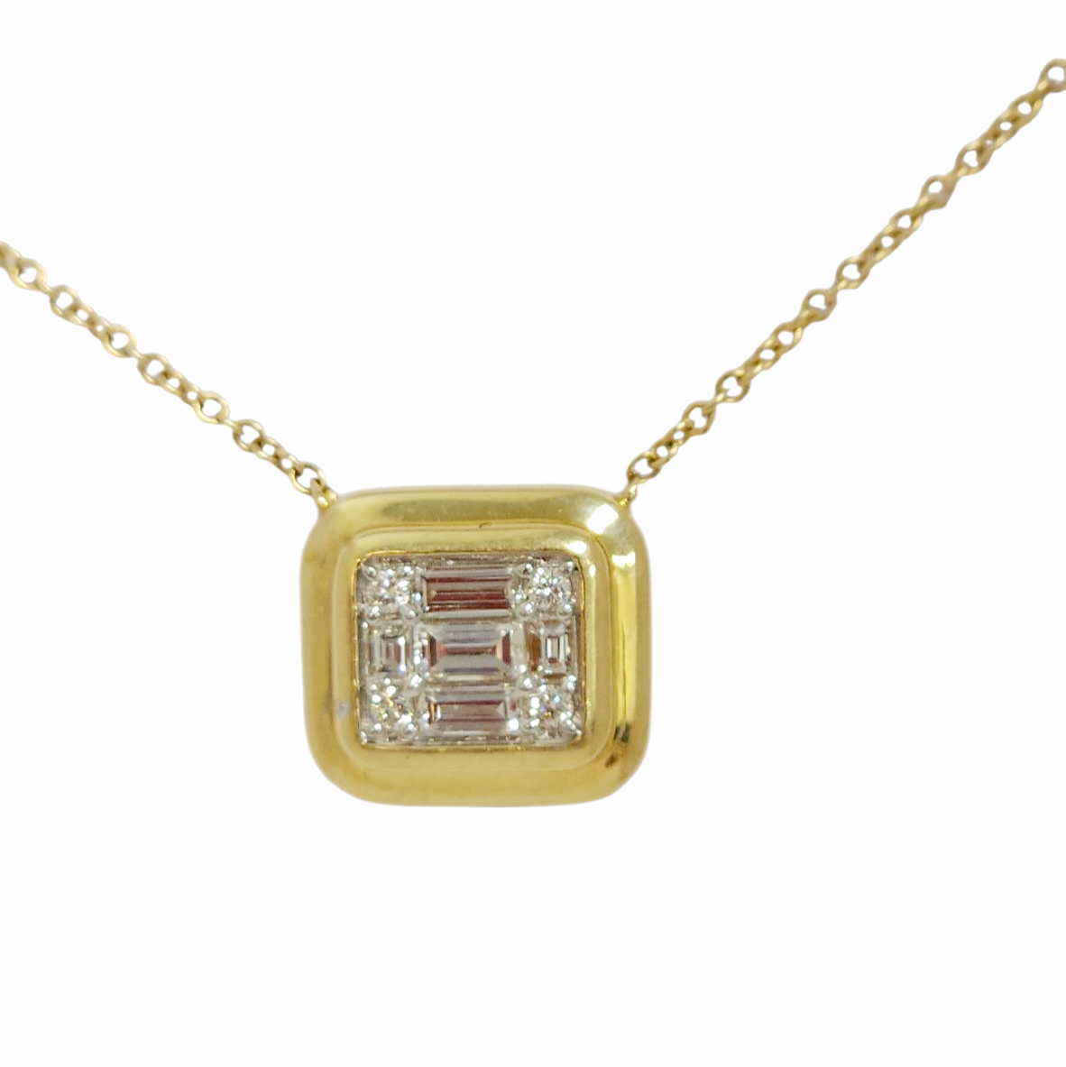 Sleek, bold, and made to glide effortlessly into your look. This 14K yellow gold slider pendant is a study in balance and brilliance. Featuring five baguette diamonds totaling 0.47 carats, and four round diamonds totaling 0.069 carats, it’s a fusion of clean geometry and soft sparkle.