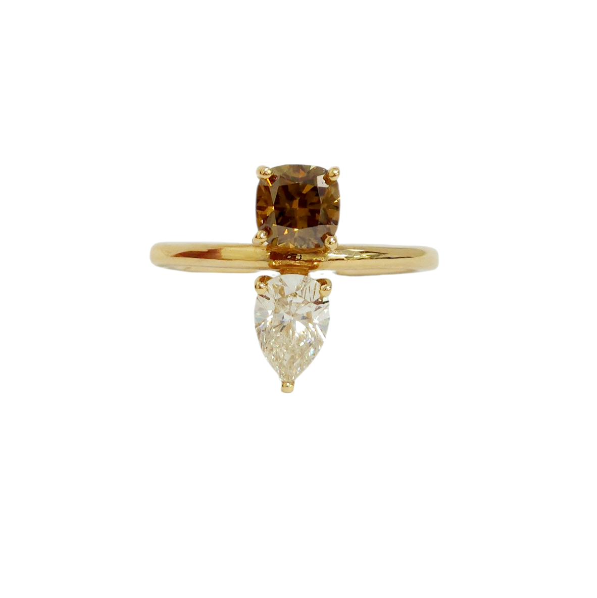 Two stones. One bold story. Introducing our 14K Brandy Toi et Moi ring — where drama meets devotion. - a captivating Brandy-hued princess cut diamond contrasting with a blazing pear-shaped diamond. Rich, warm, and unmistakably luxe! 1.80 CT total weight
