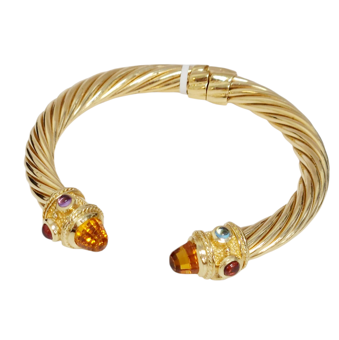 This 14K yellow gold 7mm cuff bangle bracelet (29.3g) isn't just jewelry—it's a vibrant celebration. Featuring Citrine, Aquamarine, Garnet, and Amethyst, each gemstone brings its own vibe to the party, set against a gleaming gold canvas that hugs the wrist with elegance and weight.
