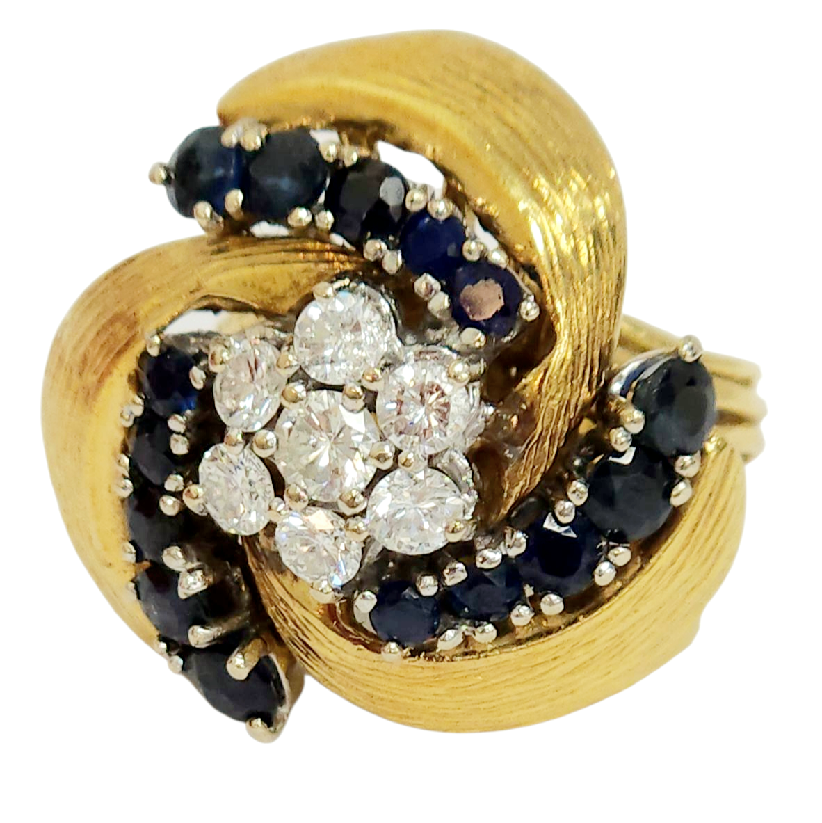 This 18K yellow gold pinwheel ring (12g, size 3.25) is a swirl of brilliance and mystique. A masterful placement of dark blue sapphires and sparkling diamonds—totaling 2 carats—creates a dynamic design that radiates movement, luxury, and individuality. Bold yet refined, it’s made for the one who commands attention without saying a word.