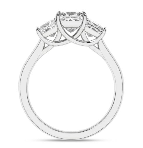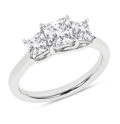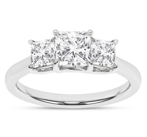 A masterpiece featuring 3 brilliant princess-cut diamonds seamlessly set in a row, creating a harmonious display of radiant beauty in 14KT white gold. This exquisite ring is studded with 2 CT total weight of diamonds