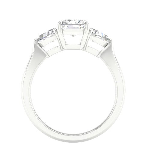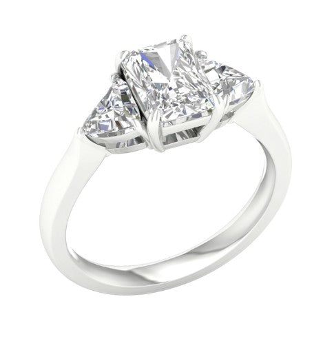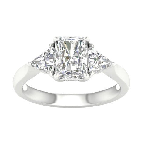 A stunning 3 stone Lab grown Diamond Engagement Ring, 2.08CT Radiant Center and 2 Trillion cut Diamonds set on either sides, each at 1/3 Ct totaling 0.70 CT. A harmonious display of beauty in 14KT white gold.