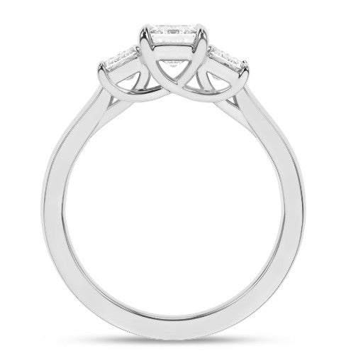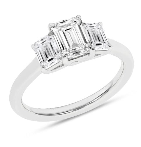 A masterpiece featuring three magnificent emerald-cut diamonds seamlessly set in a row, creating a harmonious display of radiant beauty in 14KT white gold. This exquisite ring is studded with 2 CT total weight of diamonds,