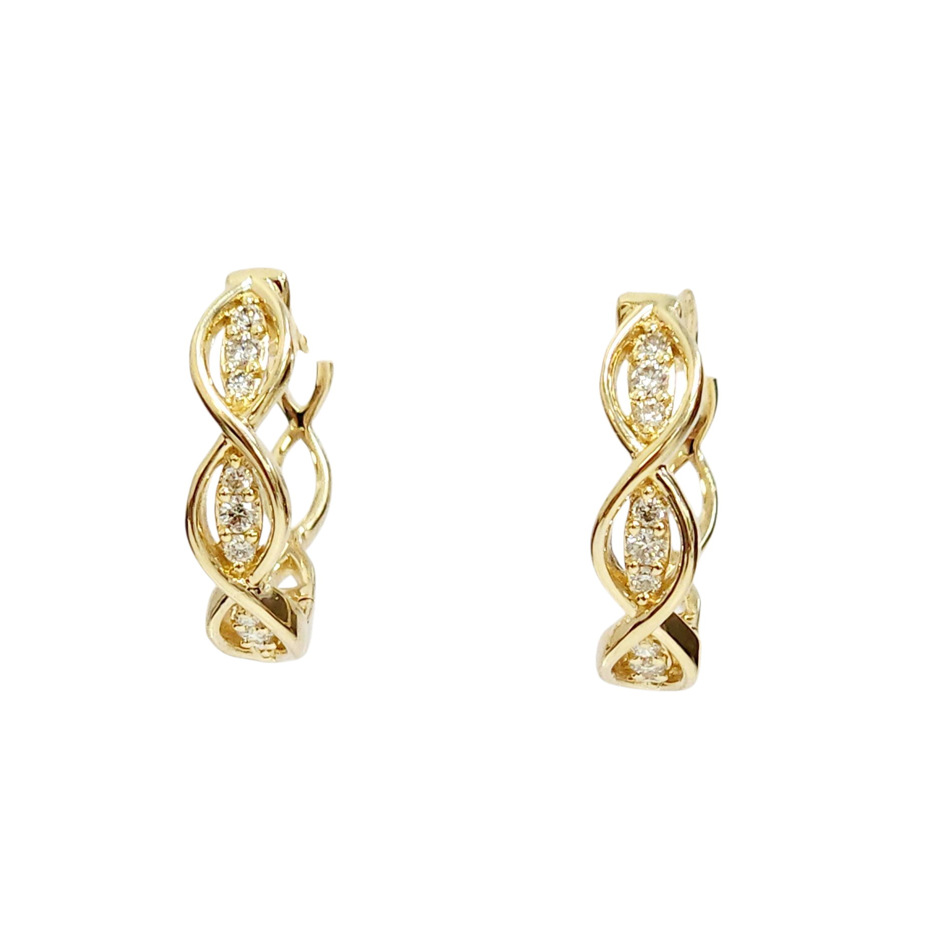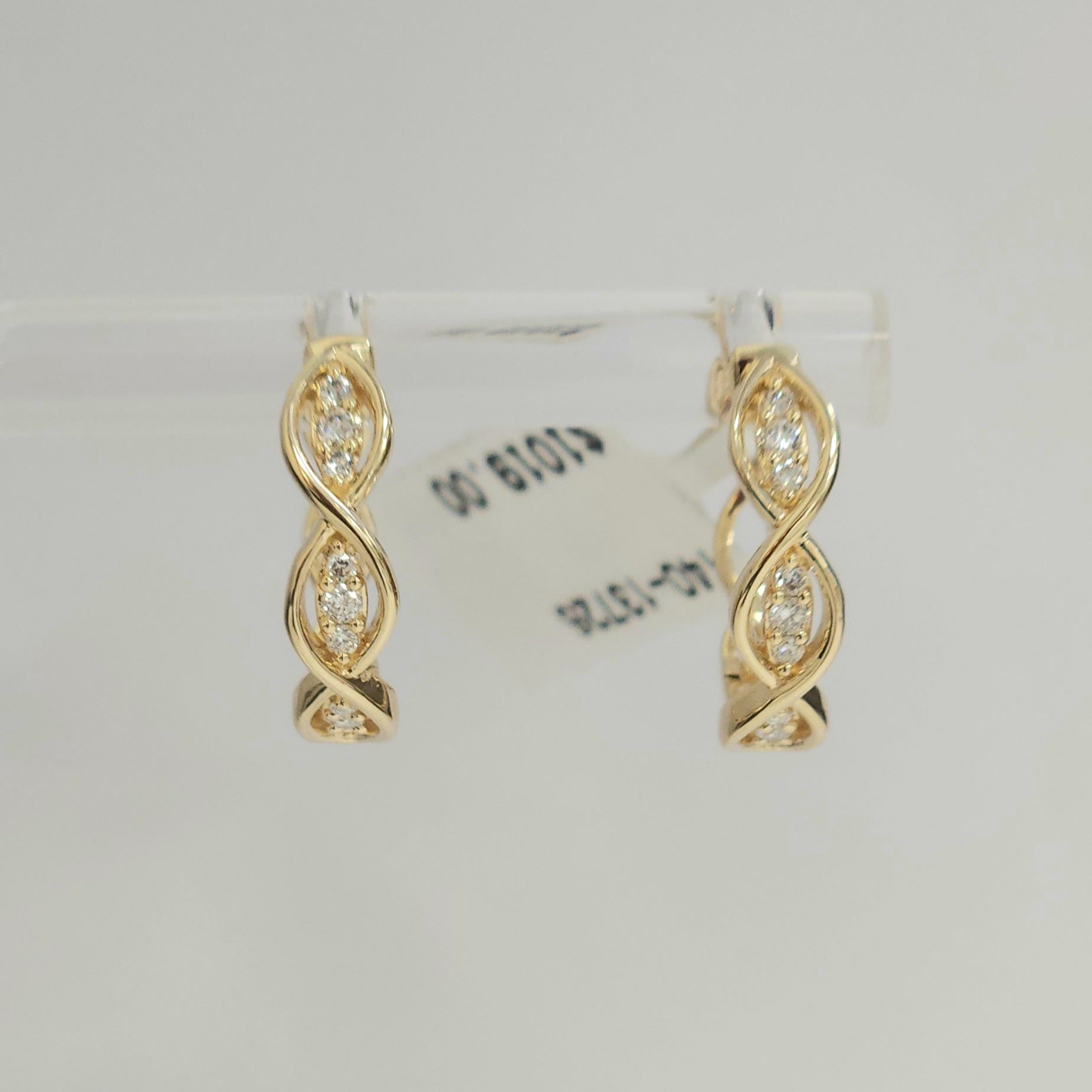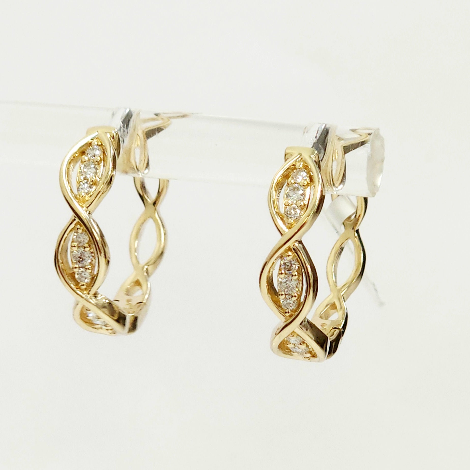 These 10K yellow gold braided hoop earrings feature a subtle 1/6 CT diamond accent, adding a refined sparkle to their intricate design. Perfect for elevating everyday looks or complementing formal attire, they combine timeless elegance with delicate craftsmanship.