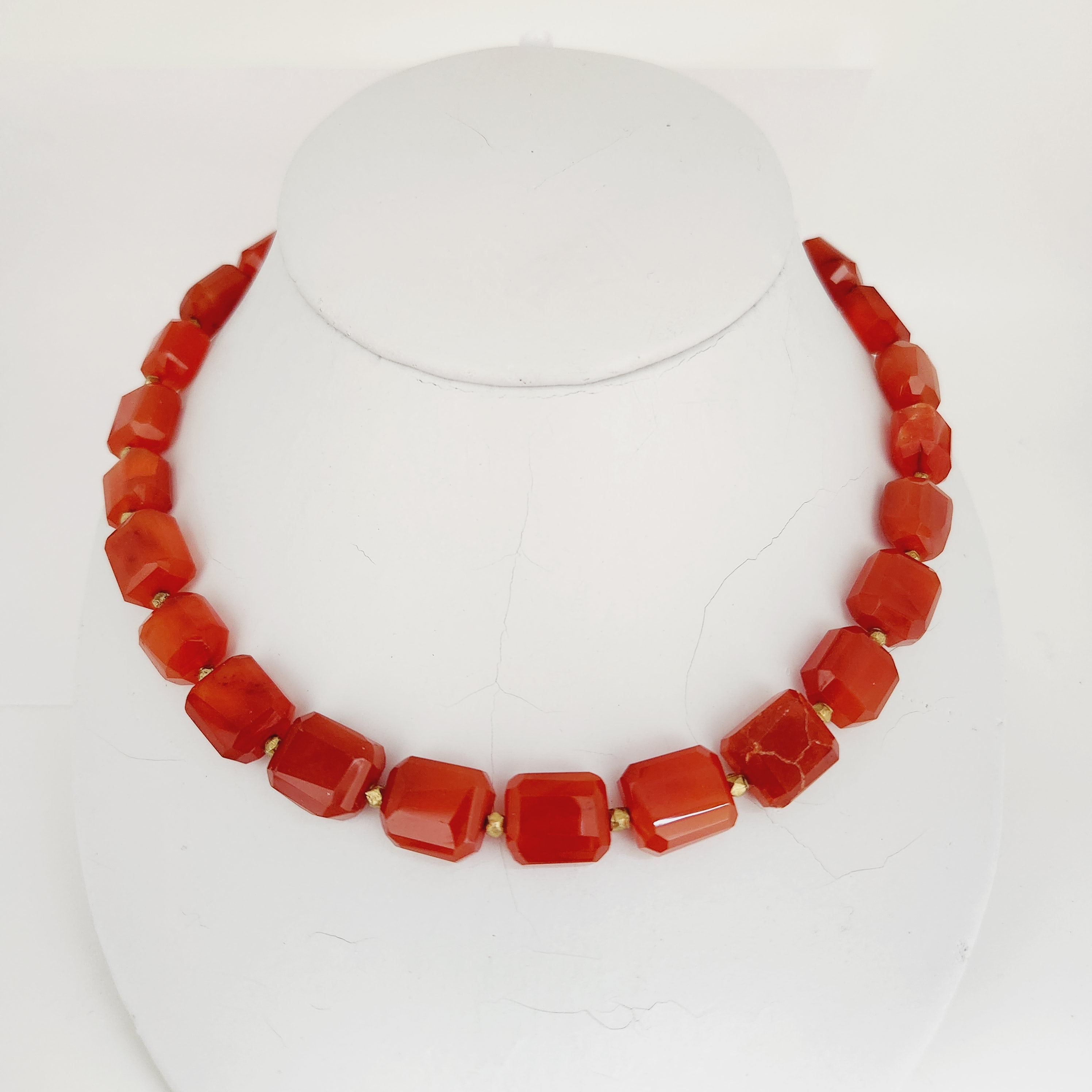 Carnelian was believed by the Romans to be a stone of courage, able to shore up confidence and strength. This fabulous bright orange Carnelian Necklace with gold tone separators features a Sterling Silver Clasp