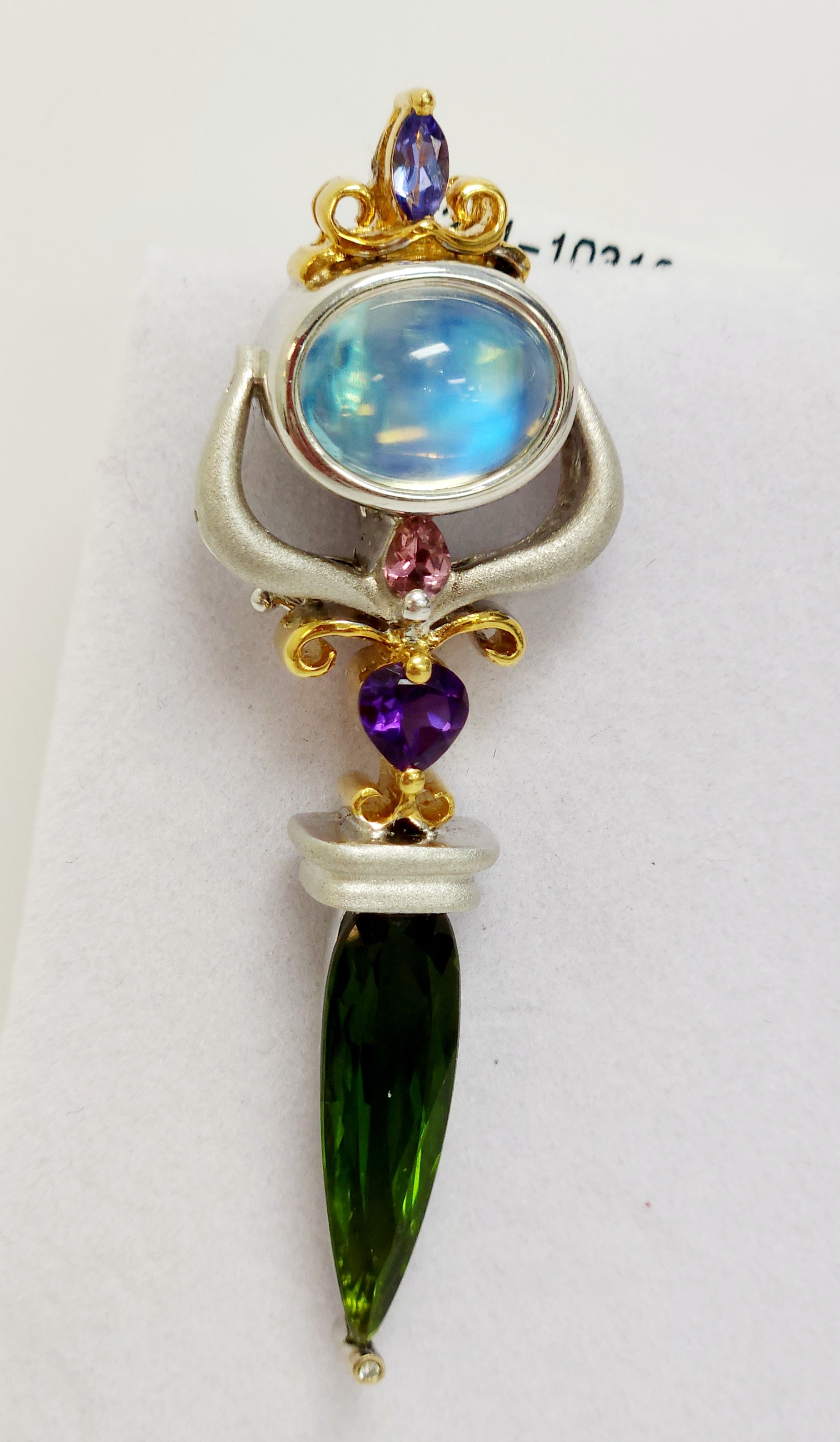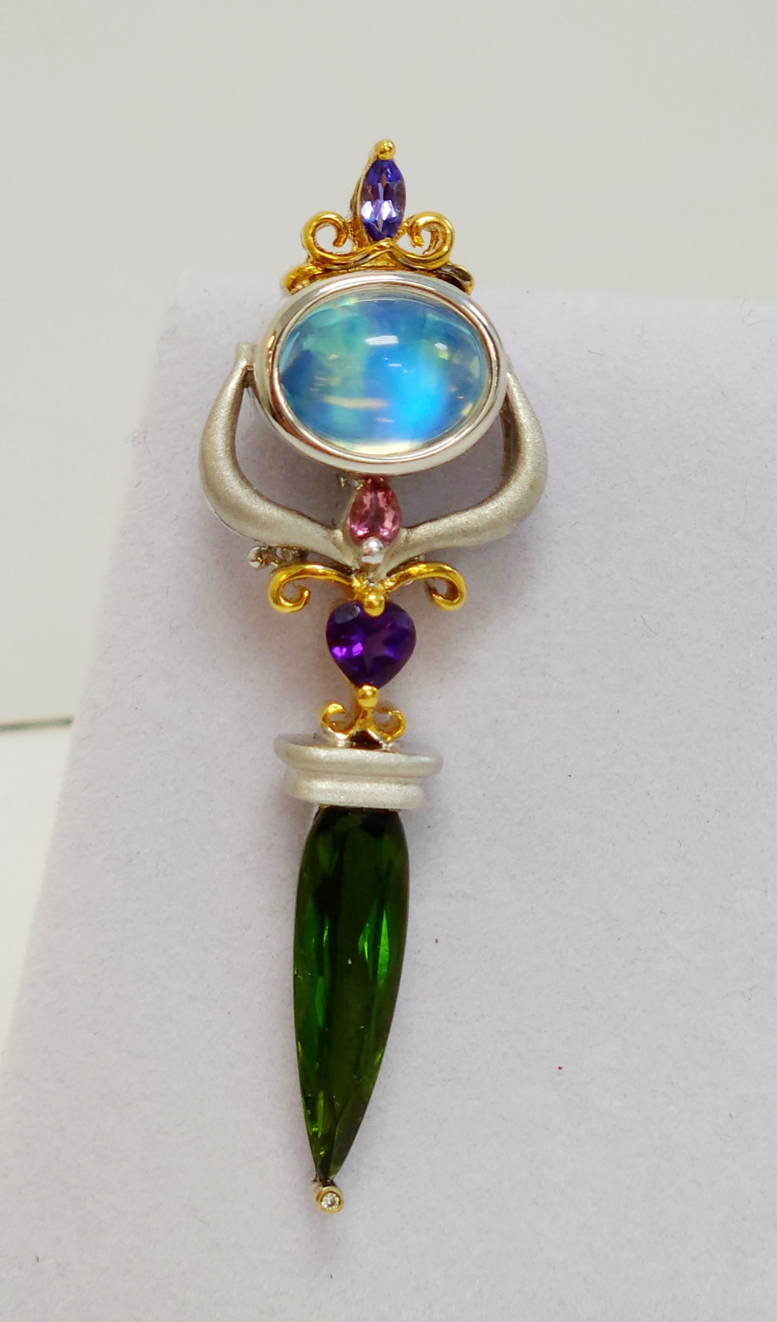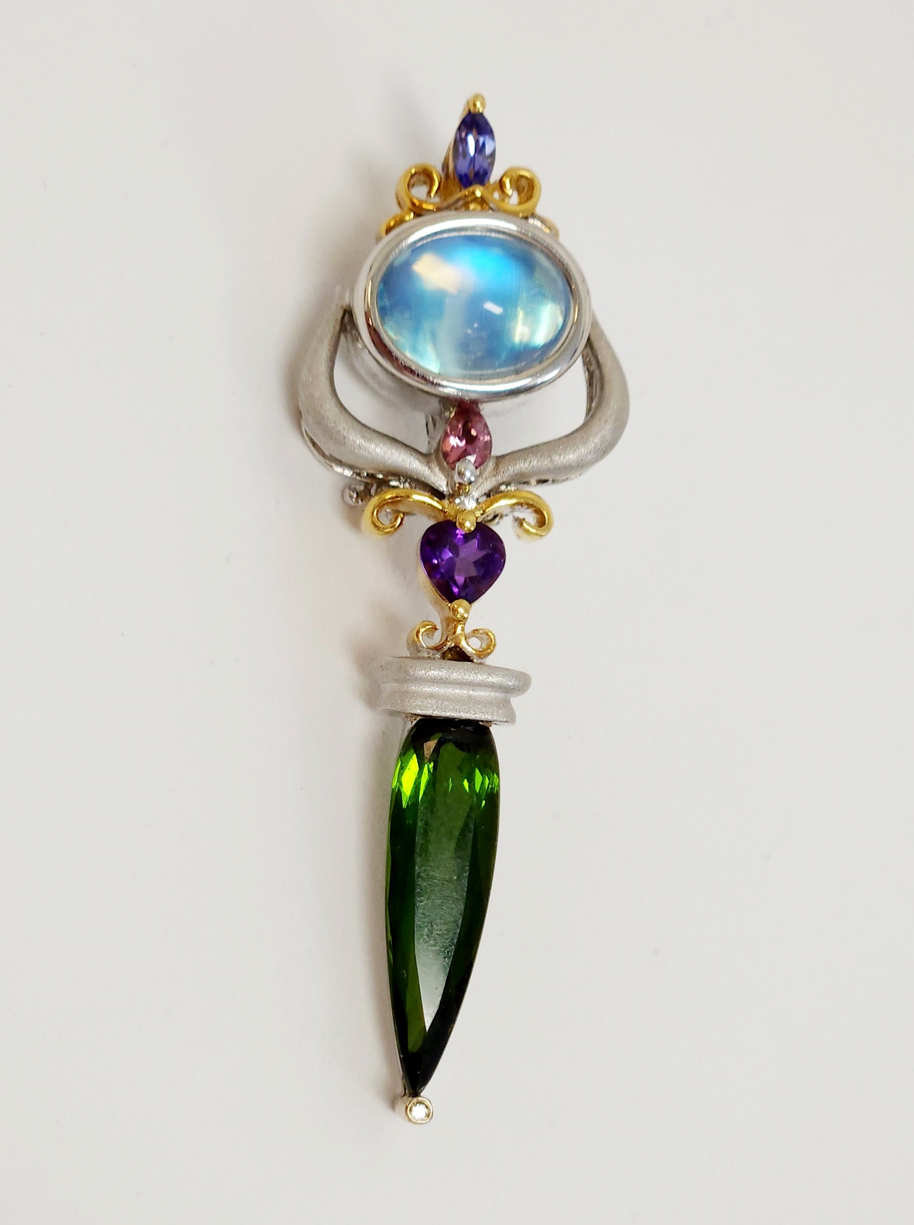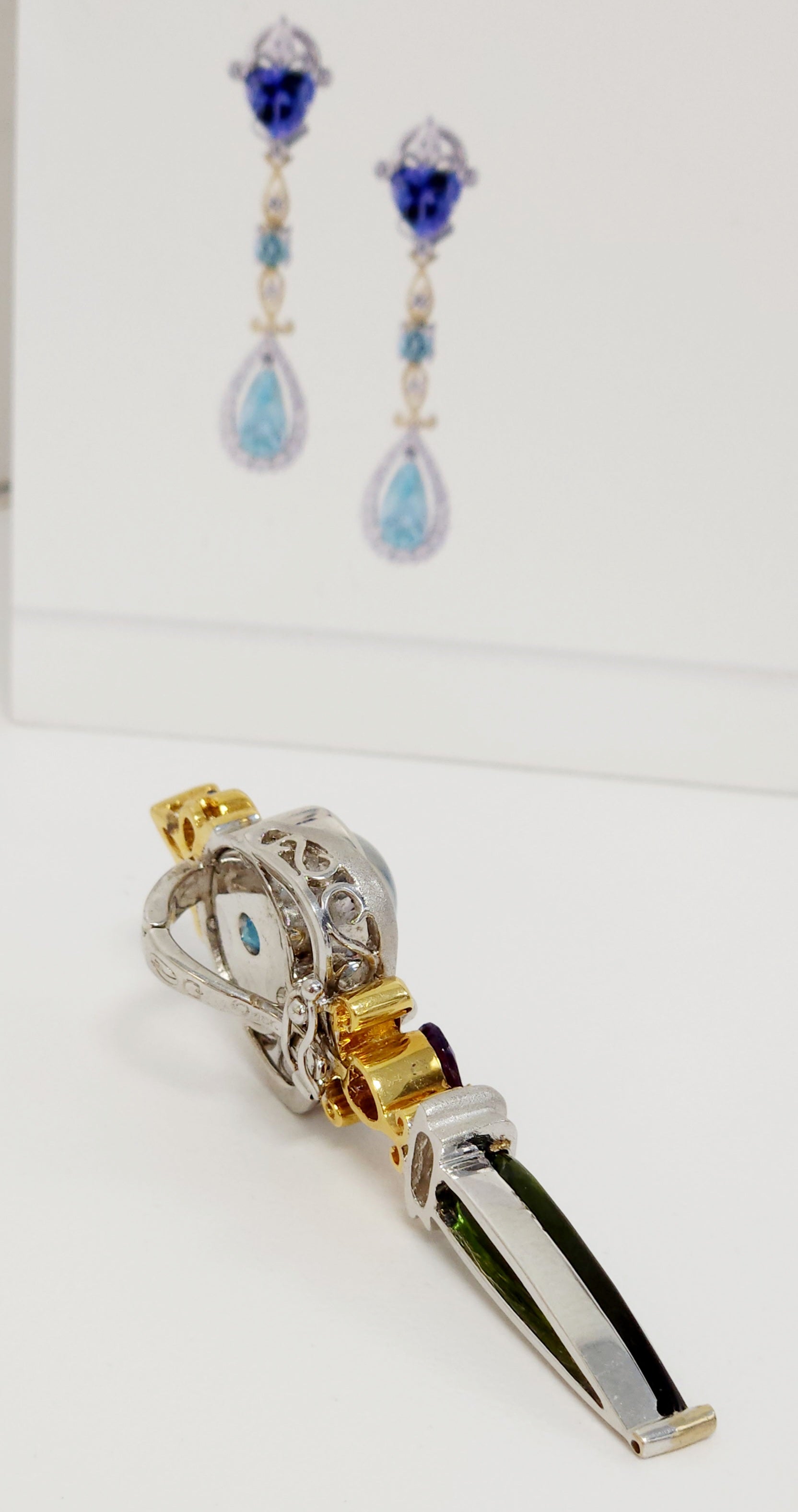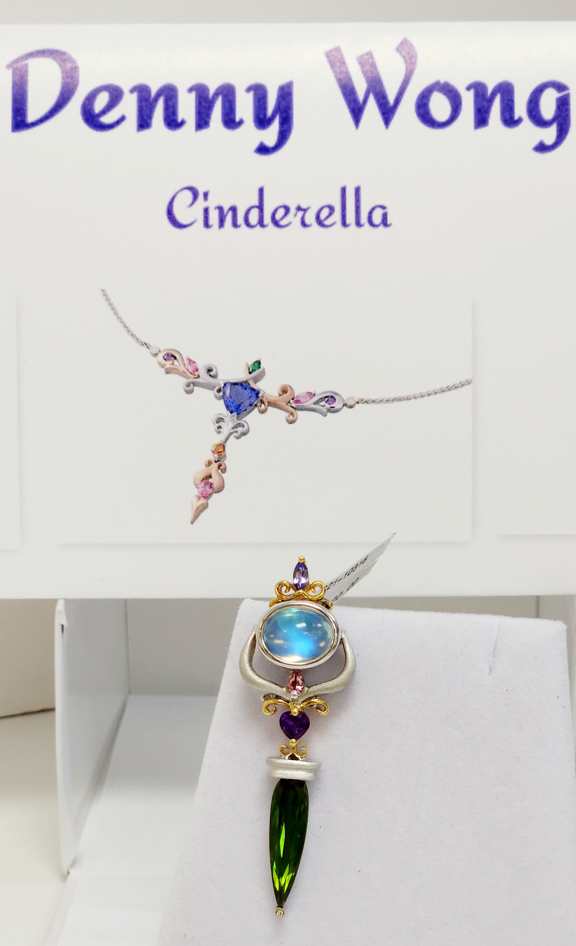 Elevate your style with the Denny Wong Cinderella Collection pendant, featuring a stunning green tourmaline centerpiece surrounded by a harmonious arrangement of multi-colored gemstones crafted in 18K. This elegant piece captures timeless beauty and adds a refined touch to any ensemble, perfect for those who appreciate exquisite craftsmanship and vibrant color.