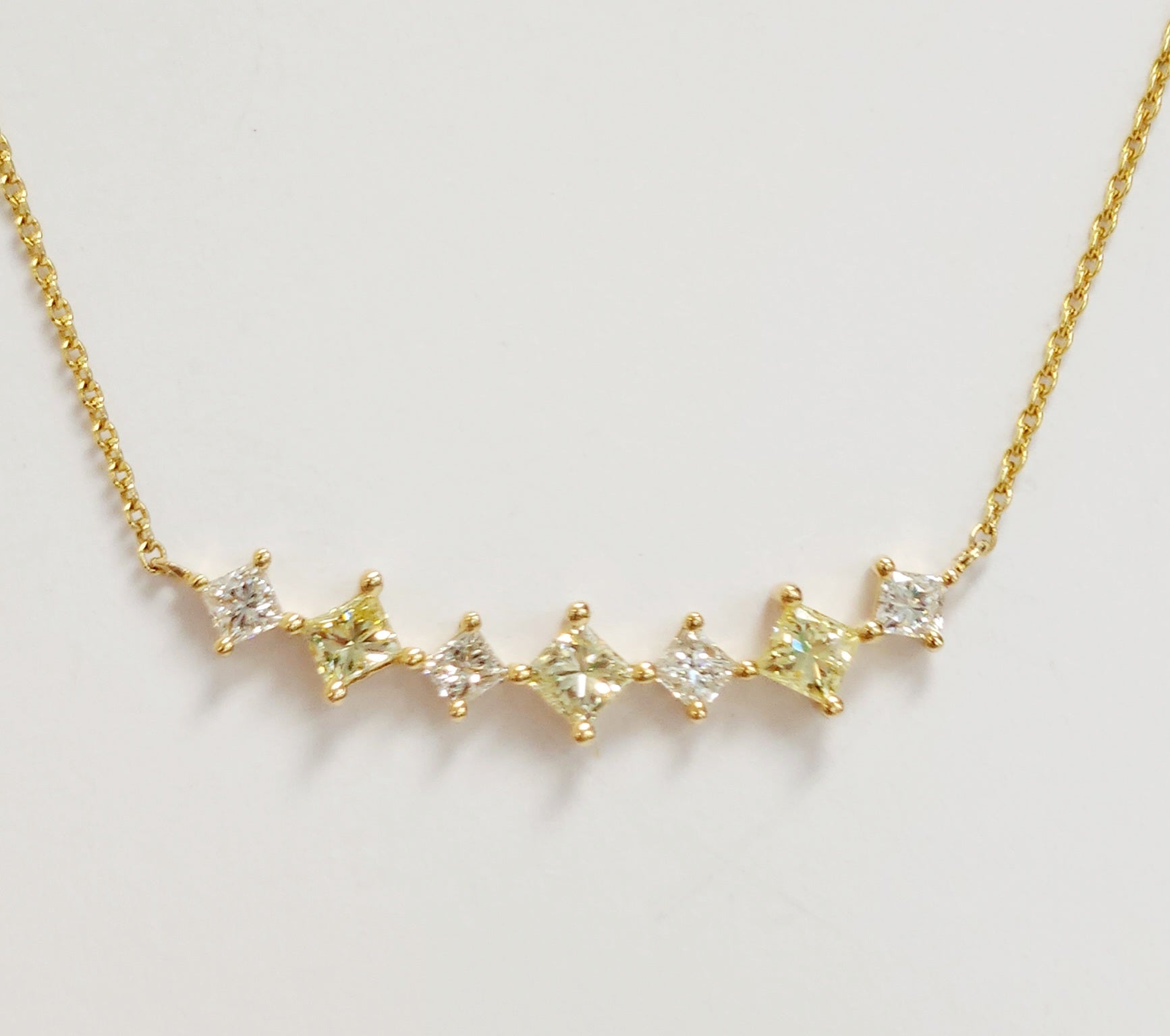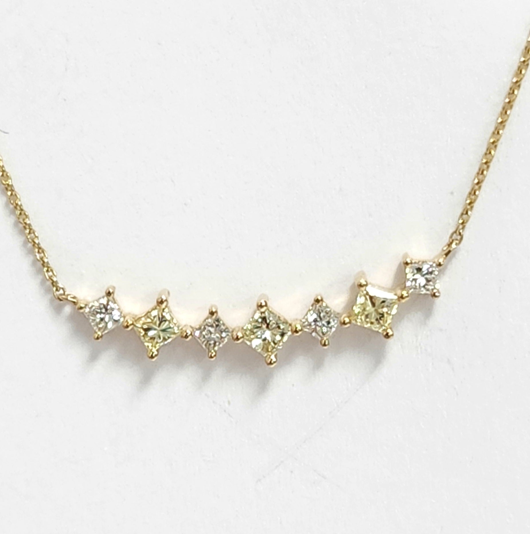 This exquisite necklace features seven princess-cut diamonds set in 14KY gold, including three vibrant canary diamonds and four classic white diamonds, totaling 0.50 carats. With SI clarity and a sophisticated design, it offers a stunning blend of brilliance and color, perfect for adding a touch of elegance to any ensemble.