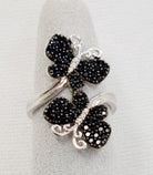 Crafted in platinum silver, the Double Butterfly Ring features a striking 1.34 Ct black spinel complemented by sparkling white zircon accents. This elegant design captures the delicate beauty of two butterflies in flight, creating a captivating statement piece that enhances any outfit with a touch of refined sophistication.