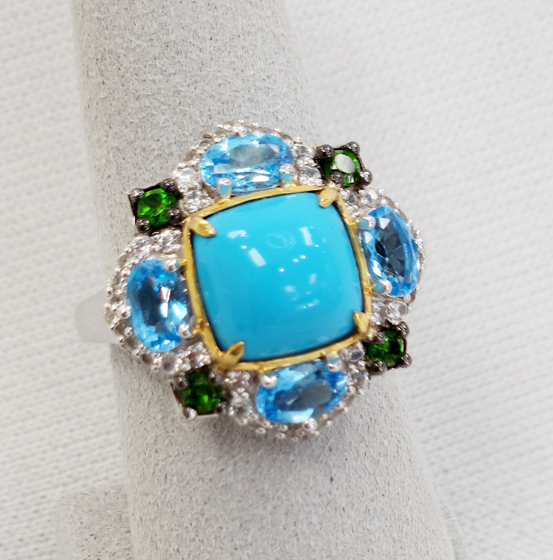 Elevate your style with the Sleeping Beauty Turquoise Multi-stone Ring, crafted in sterling silver. This exquisite piece showcases a harmonious blend of a vibrant Sleeping Beauty turquoise Cabochon Center, sparkling Swiss blue topaz, rich chrome diopside, and dazzling white zircon. Each stone adds its own unique brilliance, creating a sophisticated and captivating accessory perfect for any elegant occasion. size 7.5