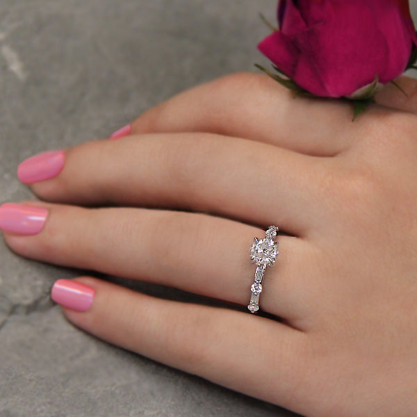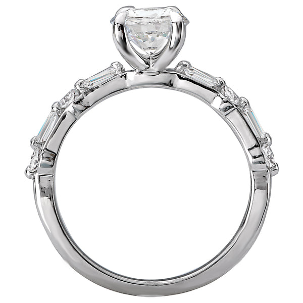 This beautiful ring showcases sparkling round and baguette diamonds set in high polished 14kt white gold. (D 1/3 carat total weight) This ring is a SEMI-MOUNT and it comes with NO CENTER STONE as shown but it will accommodate a 6.5mm round center stone.
