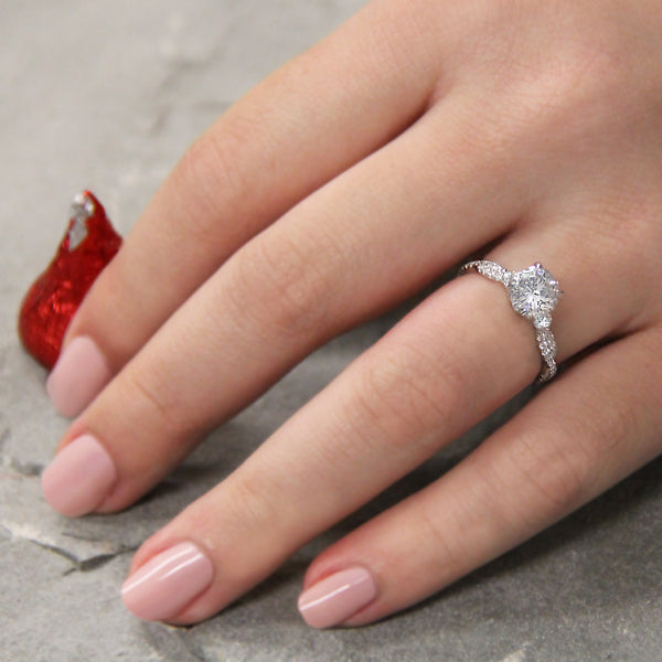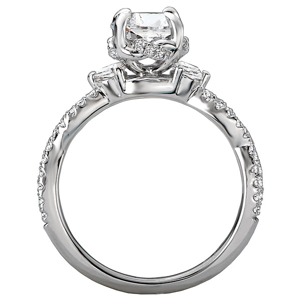 This bridal ring showcases sparkling brilliant cut round diamonds surrounding the claw prong peg head setting created in 14kt white gold. (D. 3/8carat total weight) this item is a SEMI-MOUNT and it comes with NO CENTER STONE but it will accommodate a 6.5mm round center diamond.