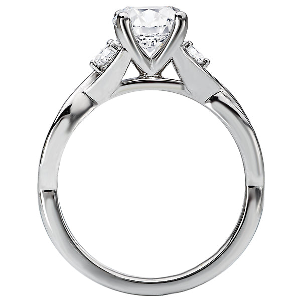 This high polished 14kt white gold semi-mount has a twisted shank along the sides of this 3-stone bridal ring. Two round diamonds are on either side of a larger center setting that will accommodate a 6.5mm round diamond. (D 1/6 carat total weight)