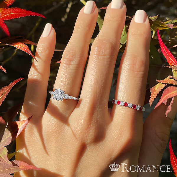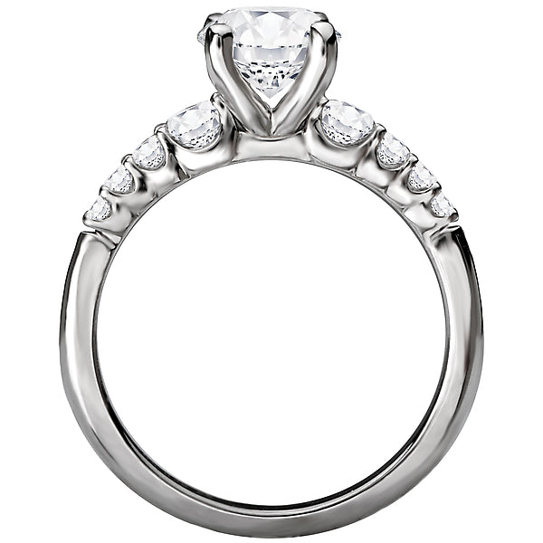 This 14kt white gold semi-mount engagement ring with graduated diamonds along the shank on either side of a center setting that will accommodate a 6.5mm round diamond. (D 1/3 carat total weight)