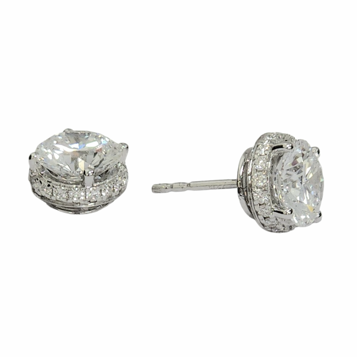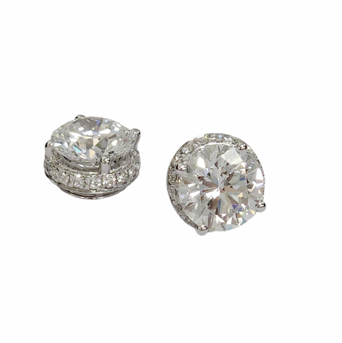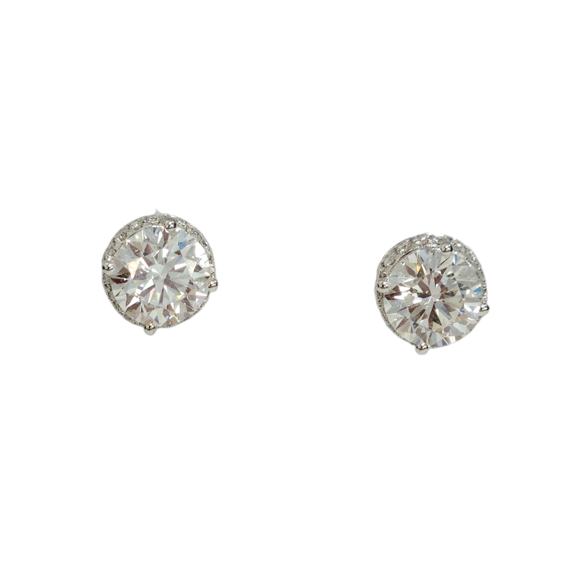 These elegant lab-grown diamond solitaire studs feature a hidden halo design that enhances their brilliance. With a total weight of 3.288 carats set in 14K white gold posts, they offer timeless sophistication and a secure, comfortable fit for everyday wear or special occasions.