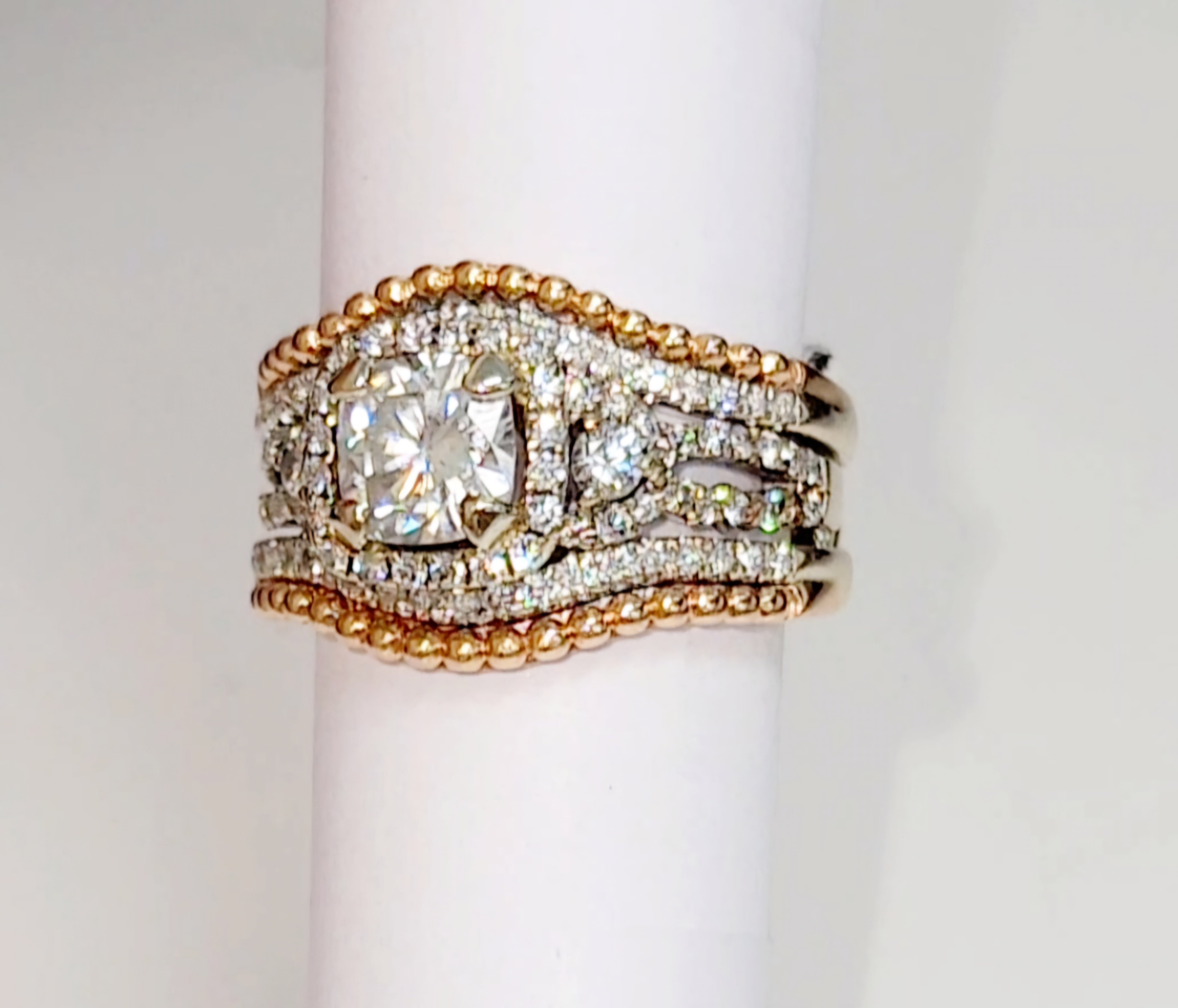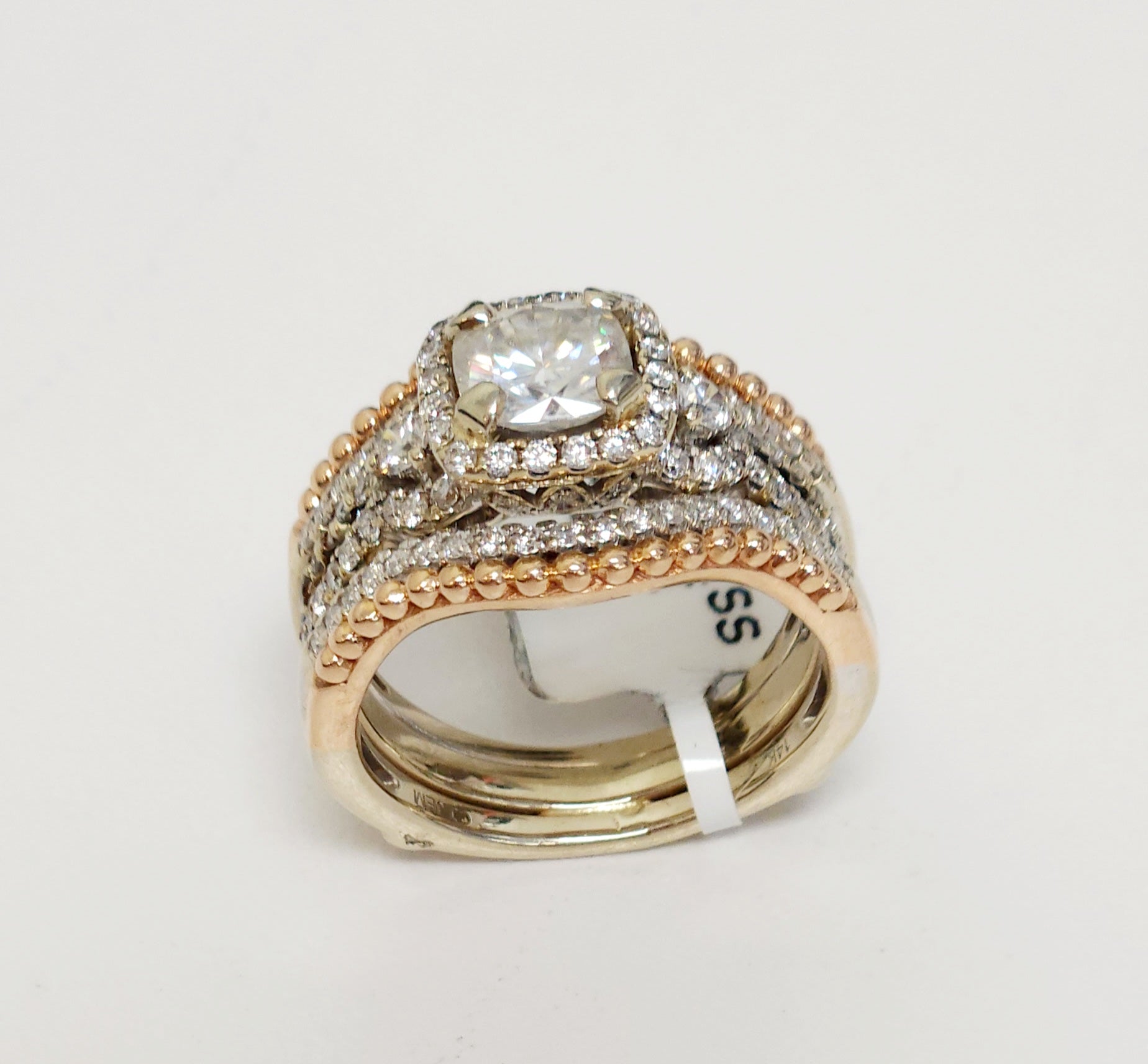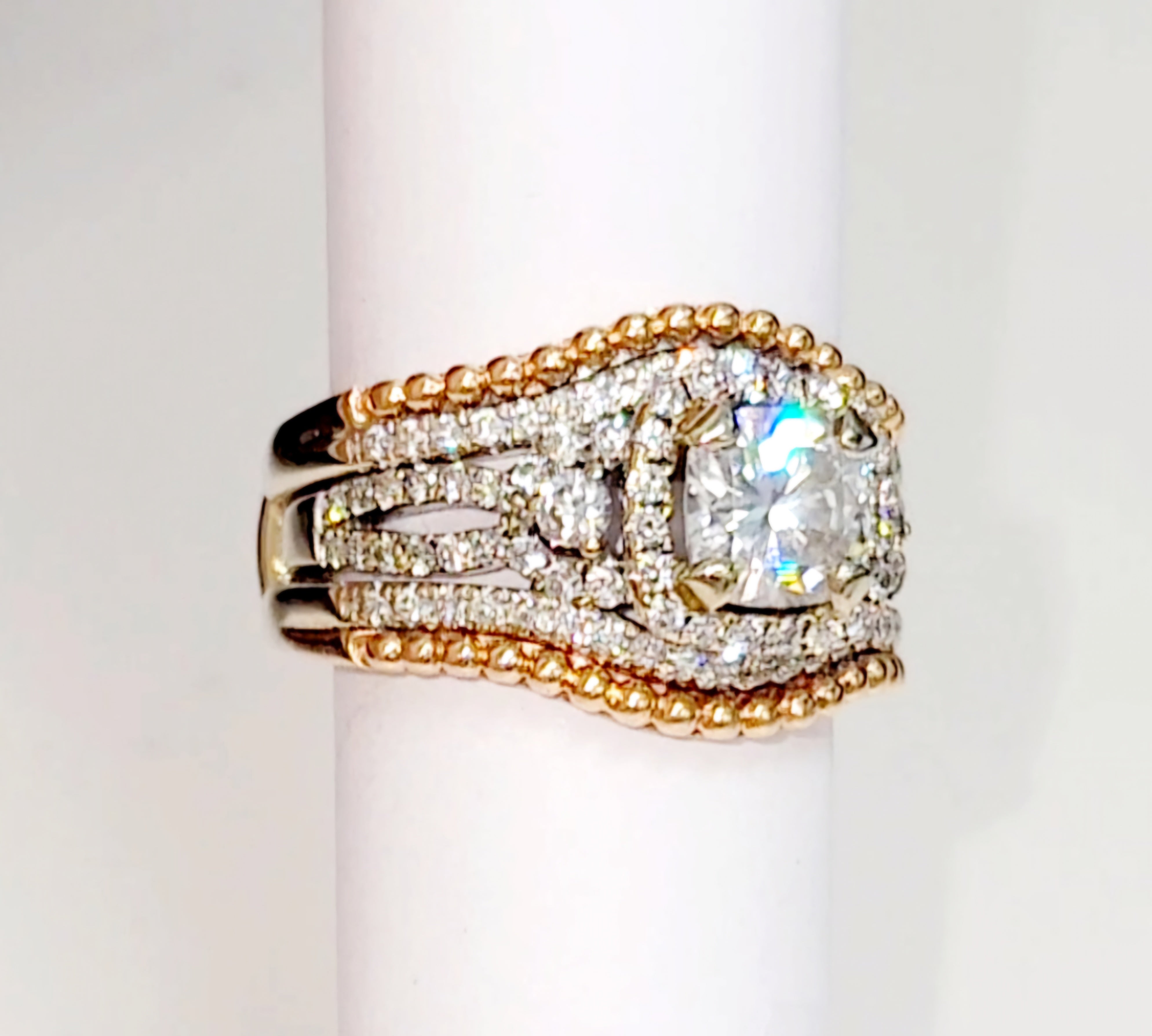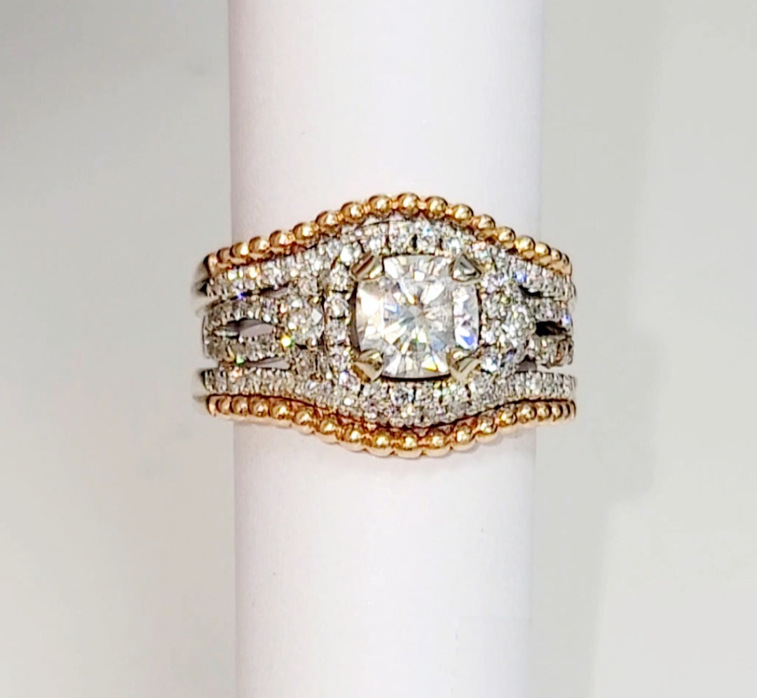 This exquisite 14K two-tone ring features a stunning 7x7 mm moissanite center stone, surrounded by 96 brilliant diamonds totaling 1.08 carats. Crafted in a harmonious blend of white and rose gold, this 11.2-gram ring offers timeless elegance and exceptional sparkle. Sized at 7.25, it is perfect for those seeking a sophisticated and radiant statement ring.